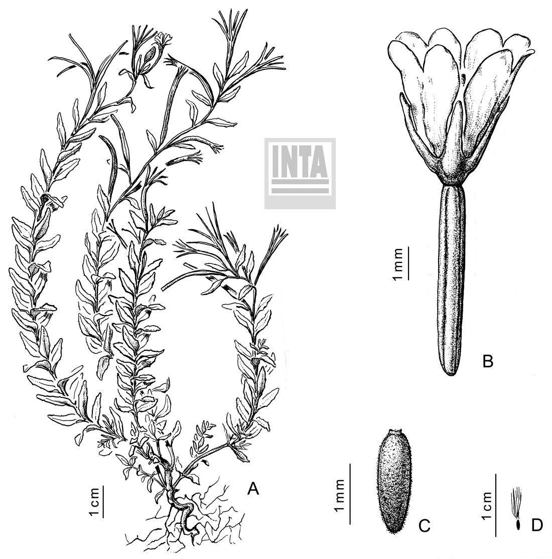Hierba de (5) 10-20 (30) cm alt., baja, cespitosa, perenne. Tallos numerosos, decumbentes, simples, raramente ramificados, glabros. Hojas de 5-16 (25) x 1,5-5 (8) mm, generalmente opuestas, alternas solo en la inflorescencia, estrechamente ovadas a lanceoladas, agudas, ocasionalmente obtusas, oscuramente denticuladas, con 1-4 dientes bajos a cada lado, glabras; pecíolos de 0,5-1 mm. Inflorescencia erecta, simple. Sépalos de 1,9-2,8 x 0,8-1,3 mm, lanceolados. Pétalos de 2,8-4,5 x (1) 1,4-2,2 mm, rosa pálidos. Ovario de 0,5-1,2 cm, glabro; pedicelo de 1-6 mm. Cápsula de 1,1-4 cm, erecta, glabra; pedicelo de 0,3-1,2 (1,8) cm. Semillas de 1,1-1,4 mm, castaño claras, papilosas, el extremo calazal con un apéndice de 0,04-0,1 mm; coma de 2,5-7 mm, blanca.