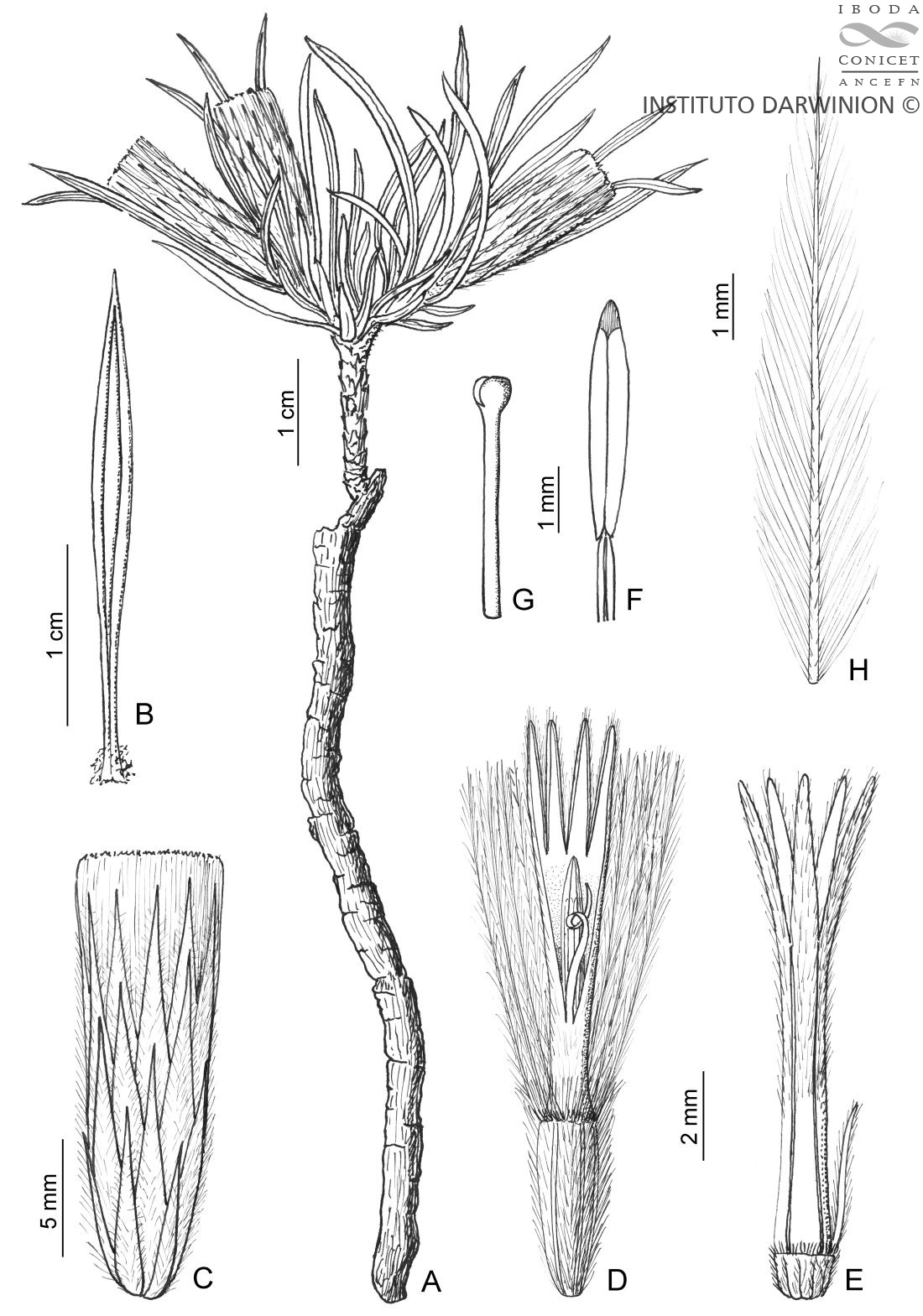 Plantas hasta de 5 cm de alto; tallos de poco más de 1 cm de largo. Hojas de 20-30 × 1-1,5 mm. Involucro cilíndricoacampanado, ca. 18 × 6 mm; filarios lanceolados, imbricados, ápice atenuado y agudo, seríceo-pubescentes. Flores del margen 5, perfectas, corolas pseudobilabiadas (4+1), ca. 12 mm de largo; Flores del centro 1, estaminada, con corola tubulosa, ca, 11 mm de largo. Aquenios ca. 5 mm de largo. Papus de las flores del margen formado por ca. 25 cerdas plumosas, de 11-12 mm de largo, el de la flor del centro formado por unas pocas setas o ausente.