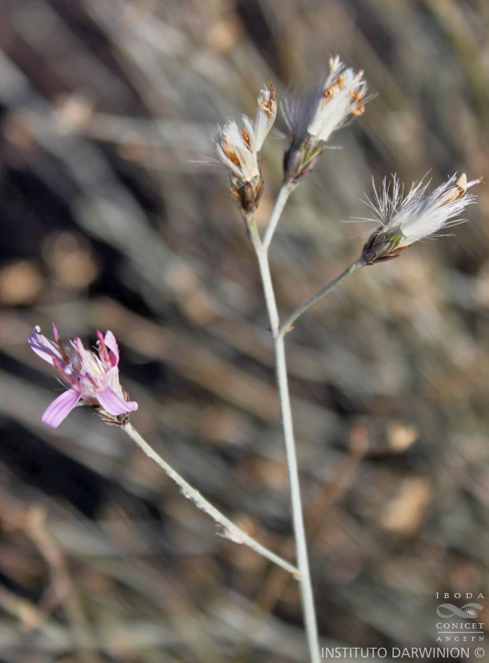 Subarbustos de 0,5-1,6 m de alto, con largos rizomas horizontales; tallos erectos, ramosos en la base, estriados, densamente seríceo-pubescentes, con pelos malpigiáceos. Hojas alternas, sésiles, estrechamente lanceoladas, de 4-12 × 0,4-1 cm, apenas atenuadas en la base, largamente acuminadas y mucronadas en el ápice, enteras en el margen, notablemente 3- nervadas en la cara inferior, argénteo-tomentosas, con pelos malpigiáceos en ambas caras. Capítulos numerosos, dispuestos en cimas corimbiformes laxas. Involucro turbinado a acampanado, de 5-7 × 4 mm; filarios anchamente ovados o lanceolados, apenas o largamente agudos, laxa a densamente tomentosos en el dorso, a veces el nervio medio y los márgenes son glabros y se observan más oscuros. Flores 5-6, perfectas, con corolas rosado-liláceas, dimorfas: las del margen 4-5, corolas 2-labiadas con labio externo 3-dentado, ca. 12 × 3 mm, labio interno 2-fido; flores del centro 1, corolas tubulosas, 5-sectas, tubo ca. 5 mm de largo, segmentos lineares, ca. 8 mm de largo, recurvados. Aquenios turbinados, de 5-11 mm de largo, cortamente pubescentes. Papus blanco, cerdas escabrosas, desiguales en longitud hasta de 12 mm de largo.