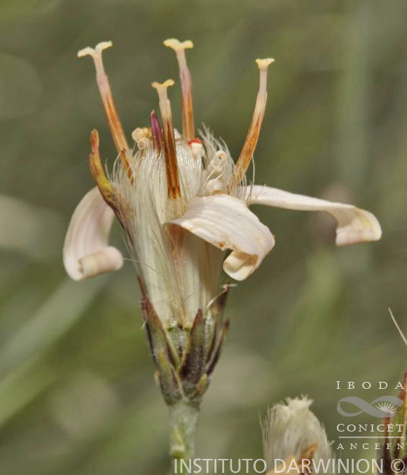 Subarbustos de 0,5-1,6 m de alto, con largos rizomas horizontales; tallos erectos, ramosos en la base, estriados, densamente seríceo-pubescentes, con pelos malpigiáceos. Hojas alternas, sésiles, estrechamente lanceoladas, de 4-12 × 0,4-1 cm, apenas atenuadas en la base, largamente acuminadas y mucronadas en el ápice, enteras en el margen, notablemente 3- nervadas en la cara inferior, argénteo-tomentosas, con pelos malpigiáceos en ambas caras. Capítulos numerosos, dispuestos en cimas corimbiformes laxas. Involucro turbinado a acampanado, de 5-7 × 4 mm; filarios anchamente ovados o lanceolados, apenas o largamente agudos, laxa a densamente tomentosos en el dorso, a veces el nervio medio y los márgenes son glabros y se observan más oscuros. Flores 5-6, perfectas, con corolas rosado-liláceas, dimorfas: las del margen 4-5, corolas 2-labiadas con labio externo 3-dentado, ca. 12 × 3 mm, labio interno 2-fido; flores del centro 1, corolas tubulosas, 5-sectas, tubo ca. 5 mm de largo, segmentos lineares, ca. 8 mm de largo, recurvados. Aquenios turbinados, de 5-11 mm de largo, cortamente pubescentes. Papus blanco, cerdas escabrosas, desiguales en longitud hasta de 12 mm de largo.