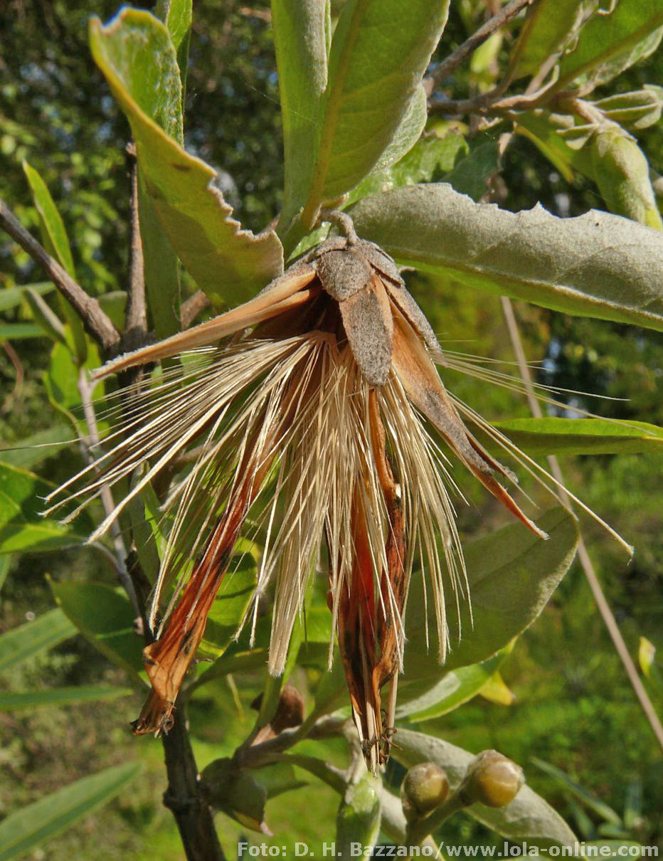 Arbustos erectos, ca. 1,5 m de alto, muy ramificados, tomentulosos en las partes jóvenes. Hojas opuestas sobre los macroblastos y braquiblastos, cortamente pecioladas; pecíolos de 4-10 mm de largo; láminas ovadas a ovado-elípticas, de 3-15 × 1,5-4 cm, subagudas y mucronadas en el ápice, enteras en el margen, coriáceas, glabras en la cara superior y blancotomentosas en la inferior. Capítulos solitarios en el extremo de las ramas. Involucro cilíndrico, de 22-30 × 5-10 mm; filarios imbricados, 6-8-seriados, los externos gradualmente más cortos, agudos en el ápice, subcoriáceos, blanco-tomentosos en el dorso, los externos ovados, los internos lanceolados. Flores 4 ó 5, isomorfas, corolas rojas o anaranjadas, liguladas, con lígula 5- dentada, ca. 15 × 5 mm, tubo ca. 15 mm de largo, glabro. Aquenios cilindroides, de 7-10 mm de largo, costados, cortamente pubescentes. Papus amarillento, formado por numerosas cerdas escabrosas, algunas más gruesas, de 20-25 mm de largo.