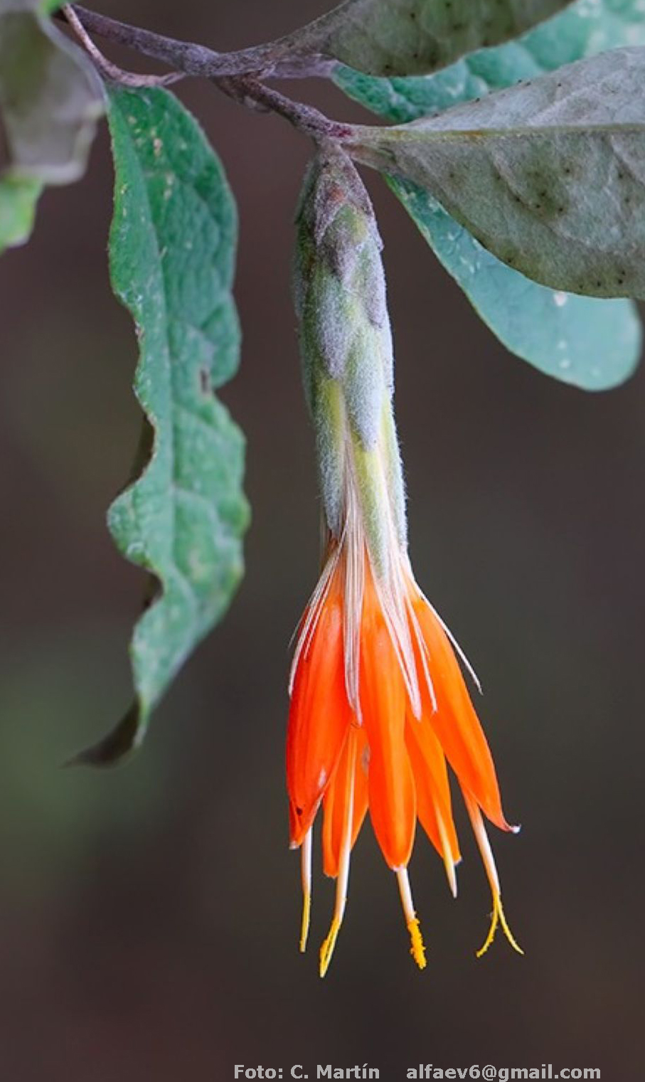 Arbustos erectos, ca. 1,5 m de alto, muy ramificados, tomentulosos en las partes jóvenes. Hojas opuestas sobre los macroblastos y braquiblastos, cortamente pecioladas; pecíolos de 4-10 mm de largo; láminas ovadas a ovado-elípticas, de 3-15 × 1,5-4 cm, subagudas y mucronadas en el ápice, enteras en el margen, coriáceas, glabras en la cara superior y blancotomentosas en la inferior. Capítulos solitarios en el extremo de las ramas. Involucro cilíndrico, de 22-30 × 5-10 mm; filarios imbricados, 6-8-seriados, los externos gradualmente más cortos, agudos en el ápice, subcoriáceos, blanco-tomentosos en el dorso, los externos ovados, los internos lanceolados. Flores 4 ó 5, isomorfas, corolas rojas o anaranjadas, liguladas, con lígula 5- dentada, ca. 15 × 5 mm, tubo ca. 15 mm de largo, glabro. Aquenios cilindroides, de 7-10 mm de largo, costados, cortamente pubescentes. Papus amarillento, formado por numerosas cerdas escabrosas, algunas más gruesas, de 20-25 mm de largo.
