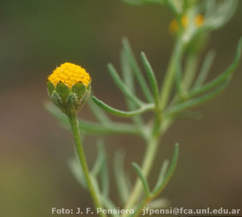 Hierbas anuales de 5-30 cm de alto, con tallos ascendentes o decumbentes, muy ramificados, difusos, hojosos hasta el ápice, costados, glabros o pubérulos. Hojas alternas, pecioladas, con pecíolos ca. 2-3 cm de largo, las basales algo arrosetadas, semienvainadoras y con bases foliares persistentes, y las caulinares dispersas; láminas pinnatisectas o bipinnatisectas, con contorno ovado, obovado o elíptico, de 2,5-3,5 × 2-4 cm, raquis y segmentos lineares, hasta de 1-3 × ca. 0,1 cm, margen entero, algo crasos, glabros o pubérulos. Capítulos homógamos, discoides, solitarios, pocos o numerosos en ramas axilares y terminales, larga o cortamente pedunculados, con pedúnculos generalmente de 2-4 cm de largo, algo engrosados en la parte apical. Involucro globoso o hemisférico, de 5-6 × 6-7 mm; filarios 14-20, 2-seriados, (7-)8(-10) por serie, los externos ovados o elípticos, ca. 5 × 1,8 mm, ápice agudo, margen entero, unidos en la base, glabrescentes o pubérulos, persistentes, los internos obovados, ca. 6 × 2 mm, más largos que los externos, ápice agudo, margen entero, libres, glabros o pubérulos, persistentes. Receptáculo levemente convexo, cónico o plano con centro cónico, glabro. Flores 56-106, isomorfas, perfectas, generalmente incluidas en el involucro, con corola tubulosa, de 2,6-2,7 mm de largo, amarilla, pubescente, 5-lobada, lóbulos de 0,4- 0,5 mm de largo. Aquenios obovoides, de 2-3 × 0,5 mm, densamente pubescentes. Papus formado por 5-6(-7) páleas angostamente elípticas u obovadas, de 2,5-2,7 × 0,5-0,7 mm, casi tan largas como la corola o sobrepasándola, libres, hialinas, persistentes, margen eroso o fimbriado, ápice aristado, con aristas ca. 0,5 mm de largo.