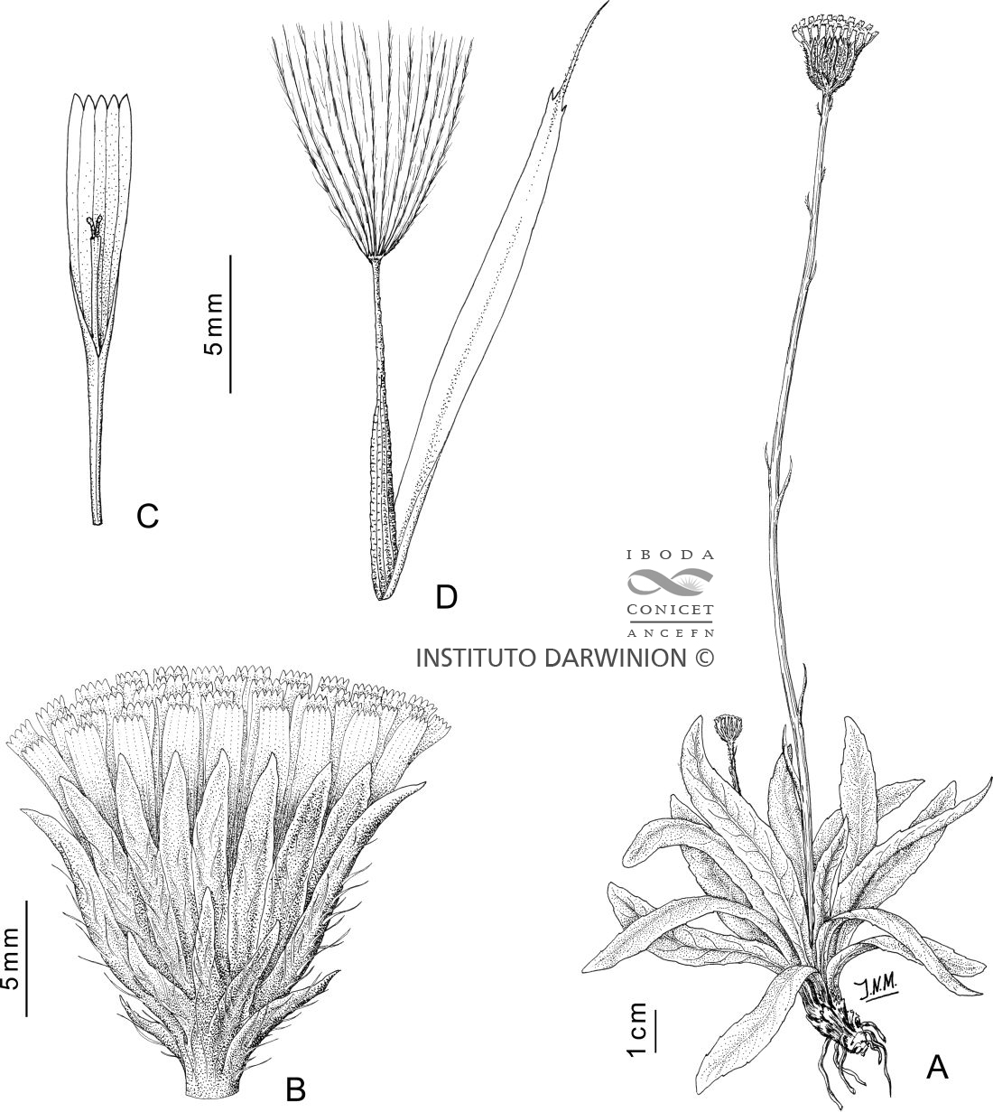 Hierbas perennes hasta de 40 cm de alto, con rizoma grueso y profundo; tallos 1-2, simples, ocasionalmente bifurcados, estriados, ligeramente pubescentes o glabros. Hojas basales en roseta, oblongas u oblanceoladas, de 5-15 × 7-17 cm, enteras o poco dentadas, base decurrente en el peciolo, ápice agudo o semiobtuso, glabras; hojas caulinares reducidas a brácteas lineares. Capítulos solitarios o raro geminados. Involucro acampanado, de 21-23 × 11-22 mm; filarios 4-5-seriados, los externos linear-lanceolados, hirsutos sobre el nervio medio; páleas del receptáculo de 15-22 mm de largo. Flores más largas que el involucro; corola amarilla o amarillo-anaranjada, de 15-20 mm de largo, lígula más larga que el tubo de la corola. Aquenios isomorfos, rostrados, de 11-15 mm de largo, con pared escamosa. Papus 1-seriado, de 8-9 mm de largo.