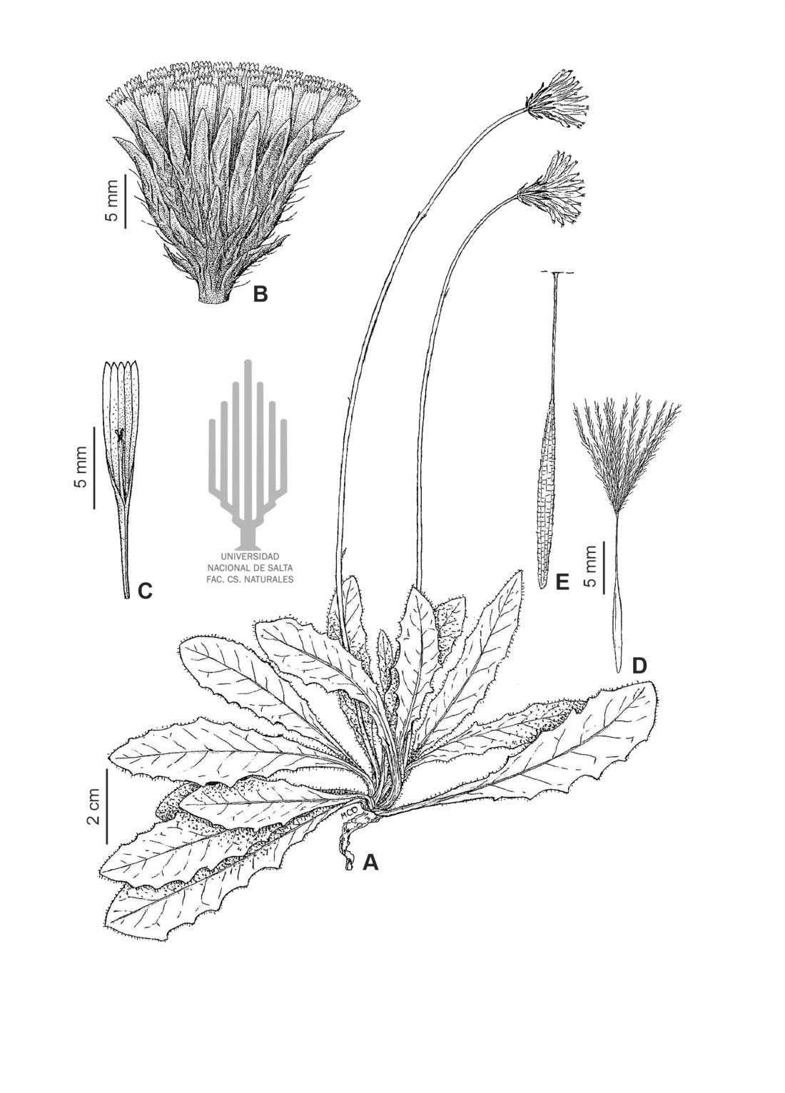 Hierbas perennes hasta de 40 cm de alto, con rizoma grueso y profundo; tallos 1-2, simples, ocasionalmente bifurcados, estriados, ligeramente pubescentes o glabros. Hojas basales en roseta, oblongas u oblanceoladas, de 5-15 × 7-17 cm, enteras o poco dentadas, base decurrente en el peciolo, ápice agudo o semiobtuso, glabras; hojas caulinares reducidas a brácteas lineares. Capítulos solitarios o raro geminados. Involucro acampanado, de 21-23 × 11-22 mm; filarios 4-5-seriados, los externos linear-lanceolados, hirsutos sobre el nervio medio; páleas del receptáculo de 15-22 mm de largo. Flores más largas que el involucro; corola amarilla o amarillo-anaranjada, de 15-20 mm de largo, lígula más larga que el tubo de la corola. Aquenios isomorfos, rostrados, de 11-15 mm de largo, con pared escamosa. Papus 1-seriado, de 8-9 mm de largo.