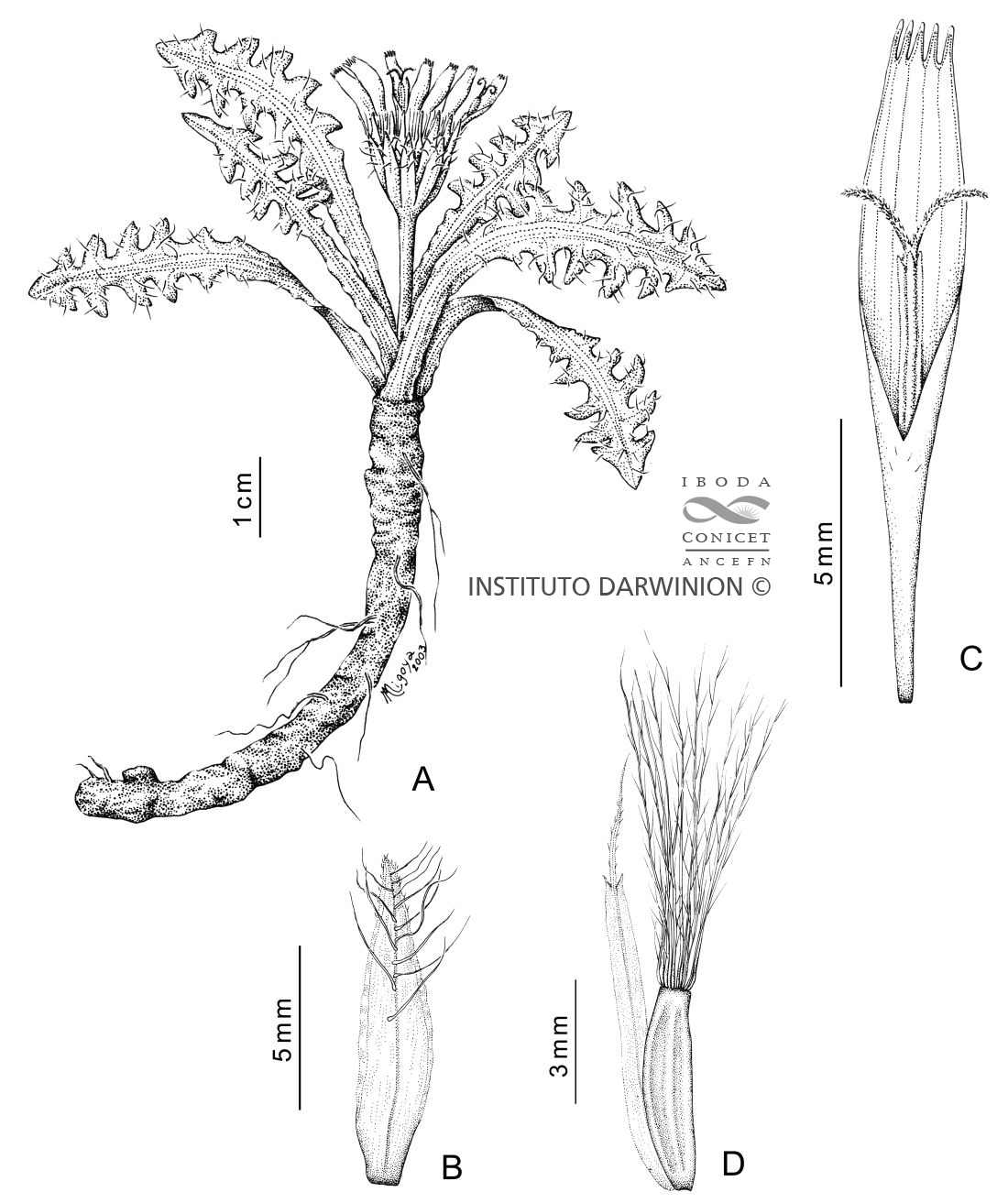 A. Planta. B. Filario externo. C. Flor (ovario y papus no dibujados). D. Pálea, aquenio y papus.