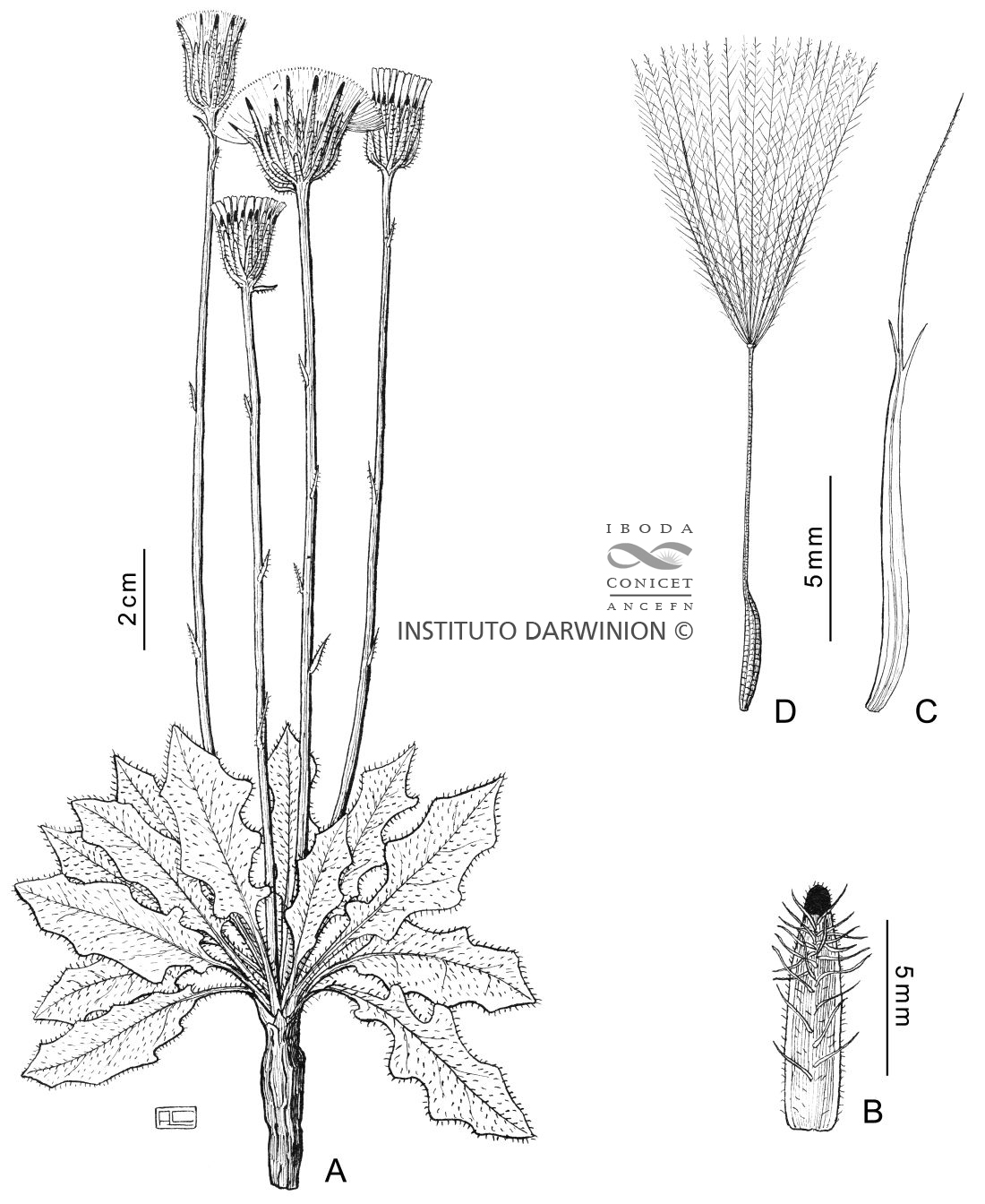 Hierbas perennes, de 17-30 cm de alto, con rizoma delgado y profundo, con tallo escapiforme único o varios, estriados, glabros. Hojas basales en roseta, oblanceoladas de 6-10 × 1,0-2,5 cm, base cortamente atenuada, ápice agudo, sinuado-dentadas o lobadas, hirsutas en ambas caras; hojas caulinares bracteiformes, lineares, de 5-12 mm de largo, agudas. Capítulos solitarios. Involucro acampanado, de 13-18 × 11-16 mm; filarios 4-5-seriados, los externos linear-lanceolados a linear-oblongos, oscuros en el ápice, hirsutos, obtusos; páleas del receptáculo de 19-25 mm de largo. Flores más largas que el involucro; corolas amarillas, de 11-12 mm de largo; lígula más corta que el tubo de la corola. Aquenios isomorfos, largamente rostrados, de 8-13 mm de largo, con pared escamosa. Papus 1-seriado, de 9-11,5 mm de largo.