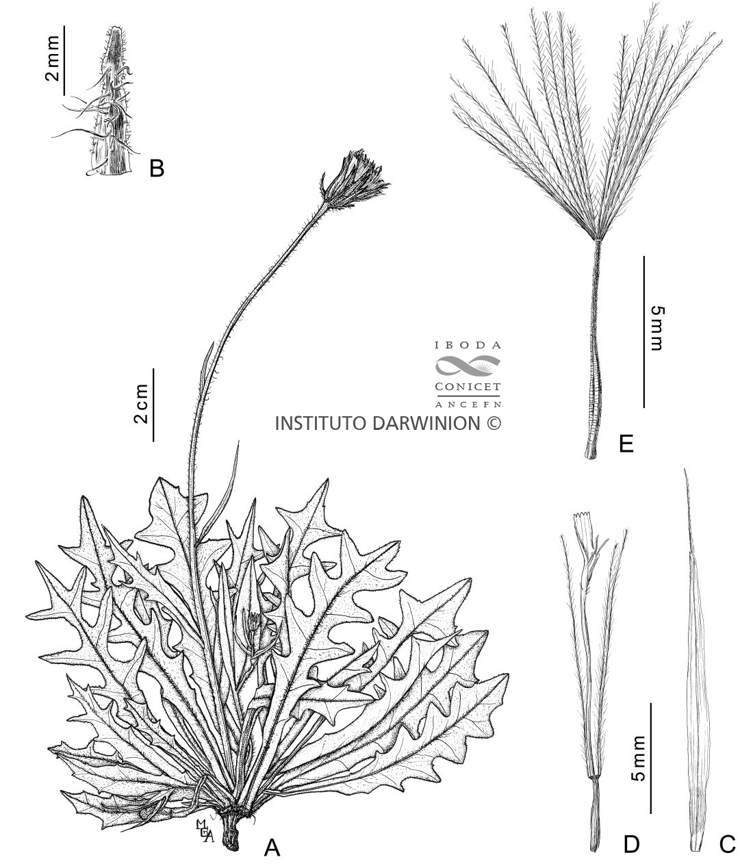 Hierbas perennes, de 8-40 cm de alto, con rizoma vertical, delgado y profundo; tallos simples o 2-3-bifurcados desde cerca de la base, estriados, pubescentes. Hojas basales arrosetadas, oblanceoladas de 3,5-23 × 0,7-5 cm, sinuado-dentadas, lobadas a pinnatifidas, ápice agudo, margen entero y lobado, hirsutas en ambas caras; hojas caulinares pequeñas, oblanceoladas, pinnatifidas o bractiformes. Capítulos solitarios. Involucro cilíndrico, 15-30 × 6-9 mm; filarios 4(-5)-seriados, los externos linear-lanceolados, ápice oscuro obtuso, lanuginosos con tricomas tiesos; páleas del receptáculo de 19-23 mm de largo. Flores más cortas que el involucro; corolas amarillas, de 10 -13 mm; lígula más corta que el tubo de la corola. Aquenios isomorfos, largamente rostrados, de 11-16 mm de largo, con pared escamosa. Papus 1-seriado, de 9-14 mm de largo.