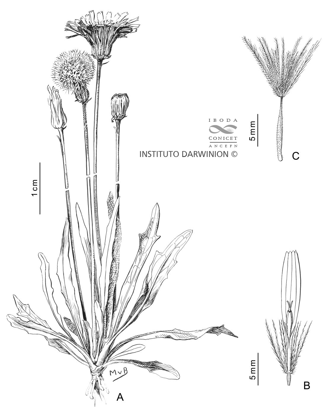 Hierbas perennes, de 10-50 cm de alto, con rizoma delgado, tallo erecto simple, a veces púrpura, con algunas brácteas lineares. Hojas arrosetadas, lanceoladas, de 2,5-17 × 0,5-2,5 mm, base atenuada, ápice agudo o semiobtuso, glabras, el margen entero o sinuado-dentado. Capítulos solitarios. Involucro cilíndrico-acampanado, de 13-28 × 8-20 mm; filarios 3-4-seriados, los externos lineares, ápice obtuso, glabros sobre el dorso, raro hirsutos y margen lanuginoso; páleas del receptáculo de 12-18 mm de largo. Flores mucho más largas que el involucro; corolas amarillas a amarillo-doradas, de 15- 23 mm; lígulas más largas que el tubo de la corola. Aquenios isomorfos, rostrados, ca. 7 mm de largo; con pared escamosa. Papus 1-seriado, de 6-16 mm de largo.