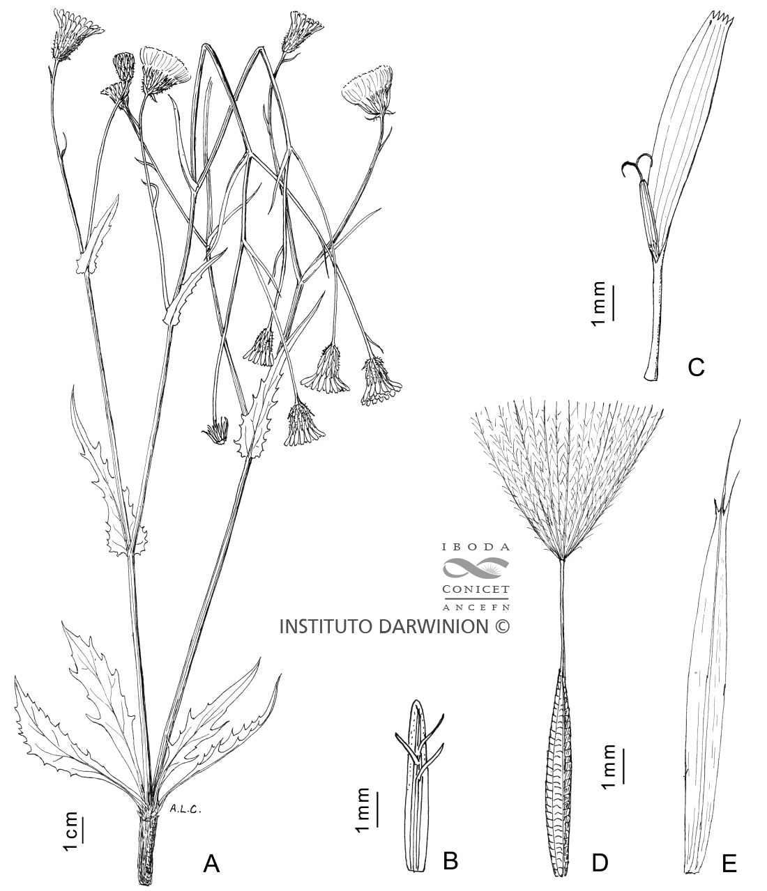 A. Planta. B. Filario externo. C. Flor (ovario y papus no dibujados). D. Aquenio y papus. E. Pálea.