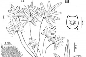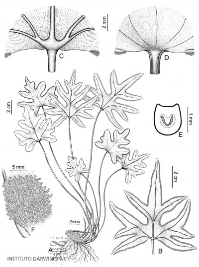 Rizomas rastreros, cortos, robustos, compactos, escamosos. Frondes levemente dimorfas, las estériles hasta de 23 cm de largo, las fértiles hasta de 45 cm de largo; pecíolos 2 o 3 veces más largos que la lámina, alado-angulados lateralmente, al menos en la mitad distal, castaño rojizos, generalmente lisos, a veces ligeramente ásperos por pequeñas estrías longitudinales, con tricomas en el tercio distal y en el lado adaxial, glabrescentes; láminas estériles pentagonales, hasta de 8 cm de largo, 5-lobuladas, pedadas; últimos segmentos oblongo-ovados a oblongo-lanceolados, redondeados o subagudos; venación anastomosada, sin hidatodos; láminas fértiles generalmente pentagonales, a veces suborbiculares, profundamente 2(-3) pinnatífidas, hasta de 18 cm de largo, con pocos a numerosos segmentos; últimos segmentos oblongo-ovados a lanceolados, raramente lineares, enteros. Soros marginales; pseudoindusios y receptáculos continuos, también en los senos. Esporangios con pedicelos cortos, células basales de la cápsula ausentes.