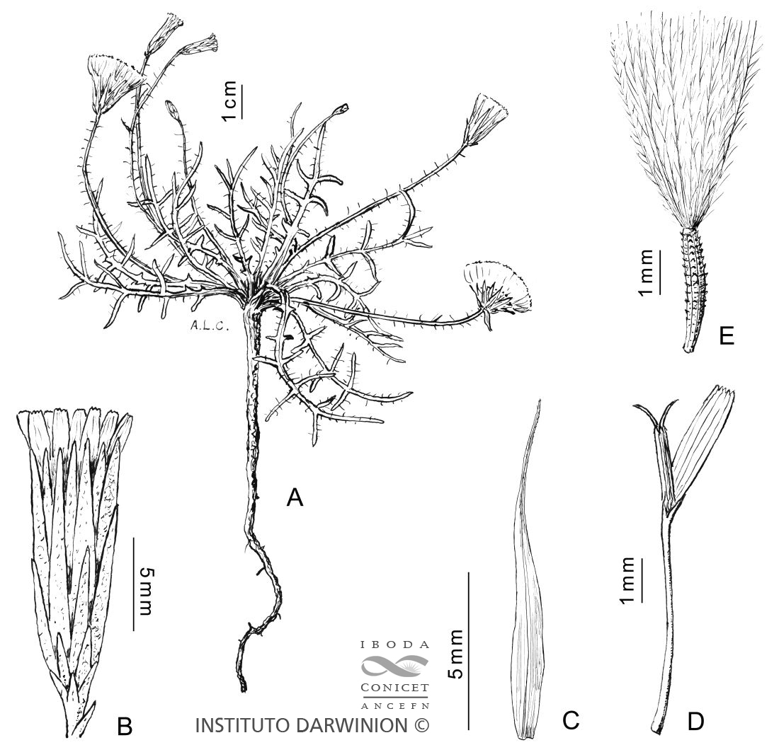 A. Planta. B. Capítulo. C. Filario externo. D. Flor (ovario y papus no dibujados). E. Aquenio y papus.