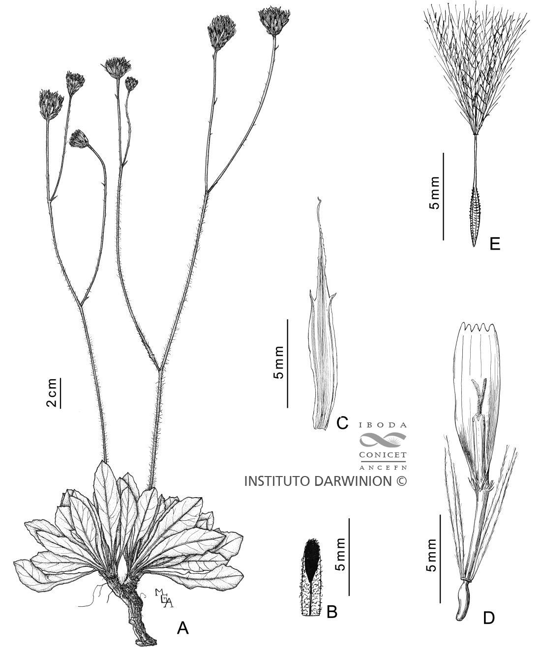 Hierbas perennes, de 10-47 cm de alto, con rizoma delgado vertical y profundo, tallo uno o varios, simples o bifurcados en la parte superior, estriados, glabros o ligeramente hirsutos. Hojas basales arrosetadas, oblanceoladas, de 3,7-18 × 1,2-3 cm, sinuadas, dentadas a pinnatifidas, con lóbulos oblanceolados u oblongo-lanceolados, de ápice obtuso, glabros o ligeramente hirsutos; hojas caulinares pocas, bracteiformes, de 1-4 × 0,2-0,4 mm, ápice agudo, hirsutas. Capítulos solitarios. Involucro acampanado, de 12-25 × 15-20 mm; filarios 4-5-seriados, los externos linear-lanceolados, ápice obtuso y oscuro, hirsutos. Flores más largas que el involucro; corolas amarillo-anaranjadas, de 15,5-18 mm de largo, lígulas más largas que el tubo de la corola. Aquenios isomorfos, largamente rostrados, 5-sulcados, de 9,5-11 mm de largo, con pared escamosa. Papus 1-seriado, de 7,5-9 mm de largo.