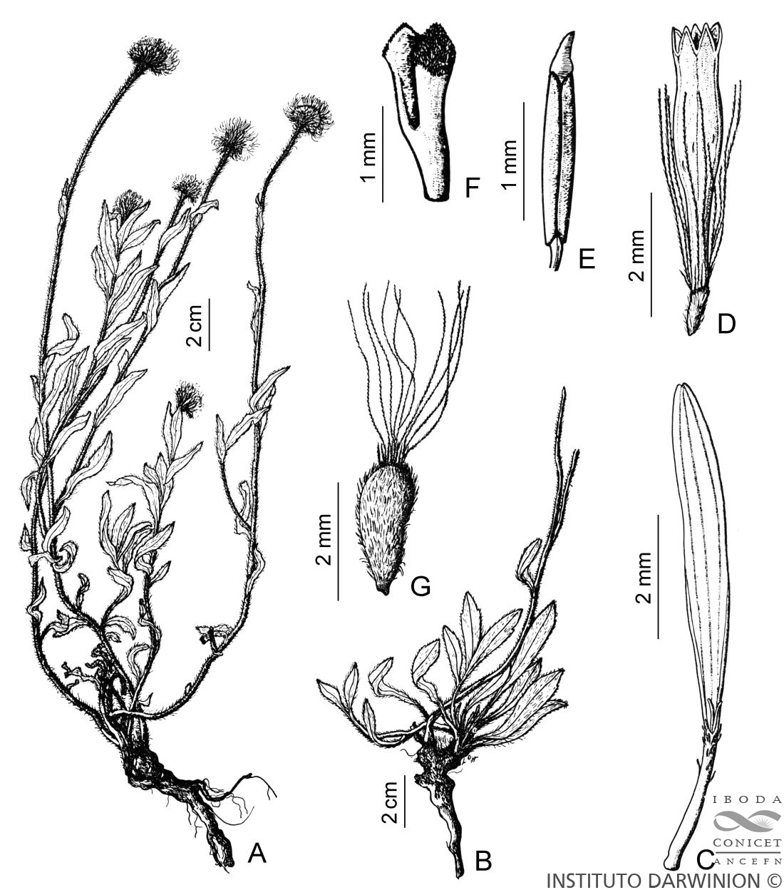 A, B. Planta. C. Corola de flor del margen. D. Flor del centro. E. Estambre. F. Estilo (sección). G. Aquenio con papus.