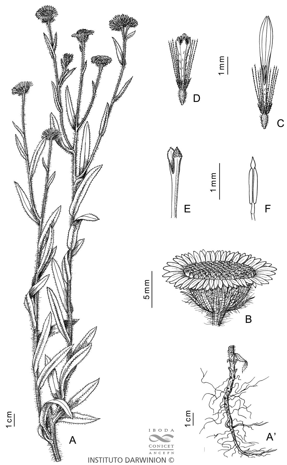 A. Planta. A’. Raíz. B. Capítulo. C. Flor del margen. D. Flor del centro. E. Estilo (sección). F. Estambre.