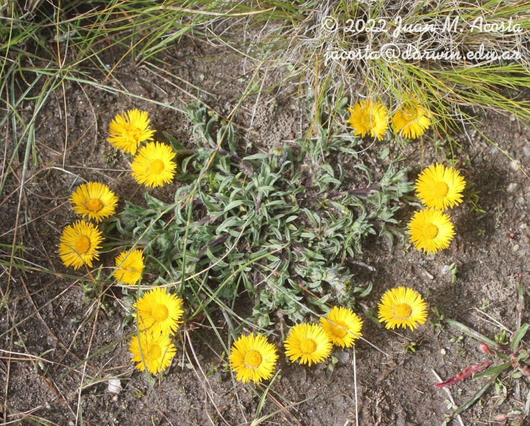 Hierbas perennes, rizomatosas, hasta de 40 cm de alto, con tallos ascendentes o erectos, ramosos en la base, hojosos, densamente hirsutos con pelos cortos densos y pelos largos, más esparcidos. Hojas elípticas a linear-elípticas, de 15-60 × 2-8 mm, base atenuada, ápice agudo, margen entero, hirsutas en ambas caras, con pelos cortos dispuestos uniformemente y otros largos en el margen y sobre el nervio medio. Capítulos solitarios, pedunculados, de 6,5-13 × ca. 12 mm. Involucro hemisférico, con filarios algo desiguales dispuestos en 3 series, linear-ovados, de 5-8 × 0,5-0,9 mm, agudos, hirsutos, con pelos cortos y largos. Flores marginales dispuestas en 2 series, con corola amarilla, de 8-13 mm de largo, limbo de 6-12 × ca. 0,9 mm; flores del centro con corola de 4-5 mm de largo. Aquenios obovoides, comprimidos, ca. 2 × 1 mm, con 2 nervios, laxamente seríceos. Papus formado por 2 series, una externa de cerdas cortas y una interna de cerdas escabrosas, de 4-4,5 mm de largo.