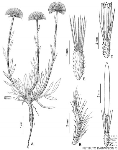 Hierbas perennes, rizomatosas, hasta de 15 cm de alto, con pocos tallos simples, hojosos, pubescentes. Hojas de 10-15 × 2- 6 mm, margen entero, incano-pubescentes; las inferiores rosuladas, obovadas, base largamente atenuada, ápice subobtuso; las superiores oblanceoladas a oblongas, base atenuada o recta, agudas. Capítulos solitarios, ca. 7 × ca. 10 mm, pedunculados. Involucro hemisférico, con filarios algo desiguales dispuestos en 3 series, linear-ovados, de 4-6 × 1-1,4 mm, agudos, pilosos. Flores marginales dispuestas en 3 series, con corola amarilla, de 5,5-7 mm de largo, limbo de 5-6,5 × ca. 0,5 mm; flores del centro con corola de 4-5 mm de largo. Aquenios obovoides, comprimidos, ca. 1 × 0,5 mm, con 2 nervios, laxamente seríceos. Papus formado por 2 series, una externa de escamas muy cortas y una interna de pocas cerdas escabrosas ca. 2 mm de largo, caducas.