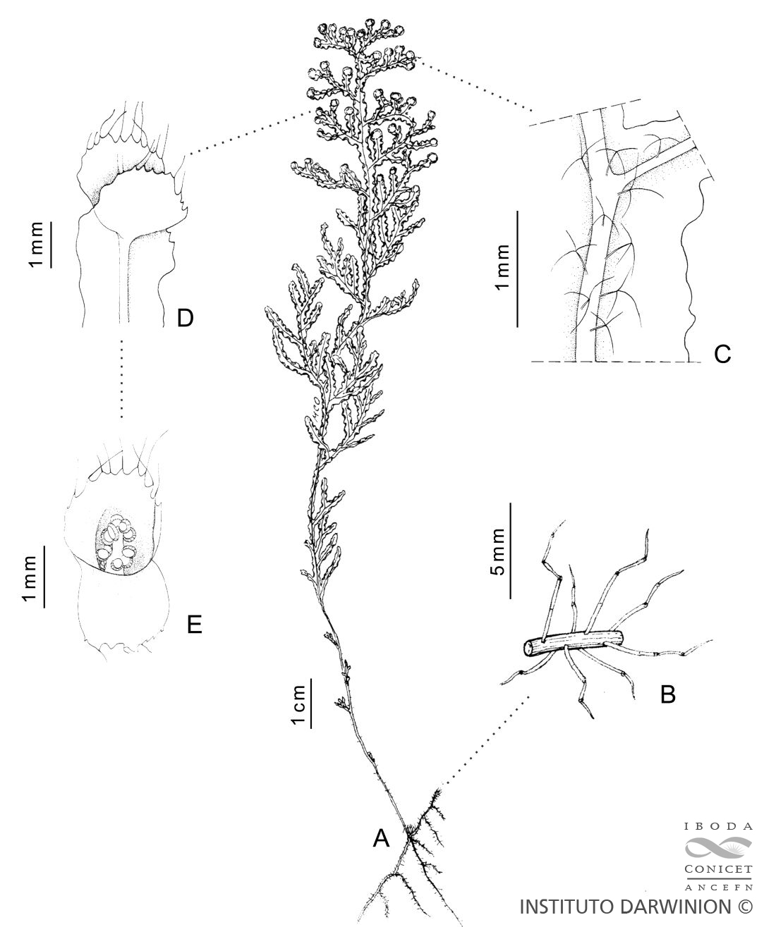 A. Planta. B. Aspecto del rizoma mostrando pelos septados. C. Detalle del raquis con pelos estrellados. D. Detalle del indusio y pelos en el extremo. E. Soro abierto mostrando receptáculo y esporangios.