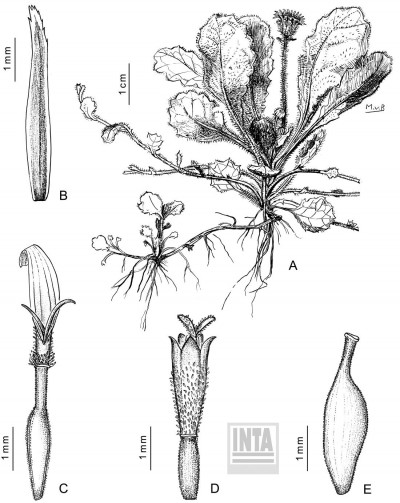 Hierbas de 4-6 cm de alto. Hojas obovado-elípticas, de 15-45 × 10-20 mm, cuneadas en la base, margen regularmente lobado (8-16 lóbulos), hirsutas. Capítulos solitarios de 4-5,5 × 6 mm, pedunculos hirsutos. Involucro hemisférico, con filarios subiguales, dispuestos en 2 ó 3 series, linear-ovados, de 3-4,5 × 0,5-0,7 mm, laxamente hirsutos, agudos, margen algo lacerado en el ápice. Flores marginales en (1)2 series, con corola blanca, de 2-3 mm de largo, limbo de 1,5-2,5 × ca. 1 mm, tubo glanduloso; flores del centro funcionalmente estaminadas, con corola ca. 2,5 mm de largo, tubo glanduloso. Aquenios 2-3 × ca. 1 mm, rostro en aquenio maduro de 0,5-1 mm de largo, glanduloso. Papus ausente.