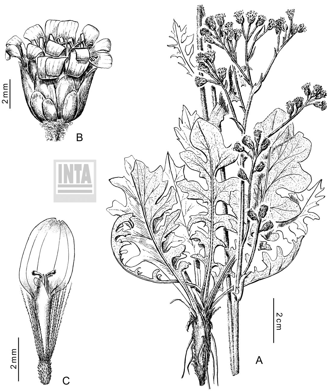 Hierbas perennes, de 50-100 cm de alto, caulescentes; tallos erectos, ramosos únicamente en la inflorescencia, laxamente albotomentosos, laxamente hojosos. Hojas inferiores dispuestas en roseta, pecioladas, con láminas de contorno anchamente oblanceolado, de 9-12 × ca. 3 cm, profundamente pinnatisectas, lóbulo terminal anchamente ovado, obtuso, lobulado, 3-5 pares de segmentos laterales anchamente oblongos, obtusos, dentados, glabrescentes en la haz, densamente albo-lanosas en el envés; hojas superiores distantes, oblongas, auriculadas y semiabrazadoras en la base, agudas en el ápice. Capítulos muy numerosos, dispuestos en una panoja de cimas corimbiformes densas. Involucro acampanado, de 6 × 6-7 mm; filarios 2-4- seriados, ovados a lanceolados, obtusos, lanuginosos o glabros, algunos filarios que acompañan a las flores lo hacen envolviendo a las mismas con la parte convexa hacia el centro del capítulo. Flores ca. 25, corola azul o lilacina, las del margen con tubo de 3- 4 mm de largo, labio exterior de 2,5-4 × 1,5-2 mm. Aquenios turbinados, papiloso-pubescentes. Papus blanco, cerdas plumosas desde la base, de 3-4 mm de largo.
