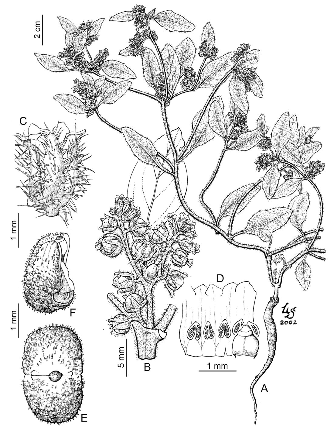 A. Planta en flor. B. Detalle de un nudo con hoja e inflorescencia. C. Flor. D. Corola desplegada mostrando androceo y gineceo. E. Fruto. F. Clusa.