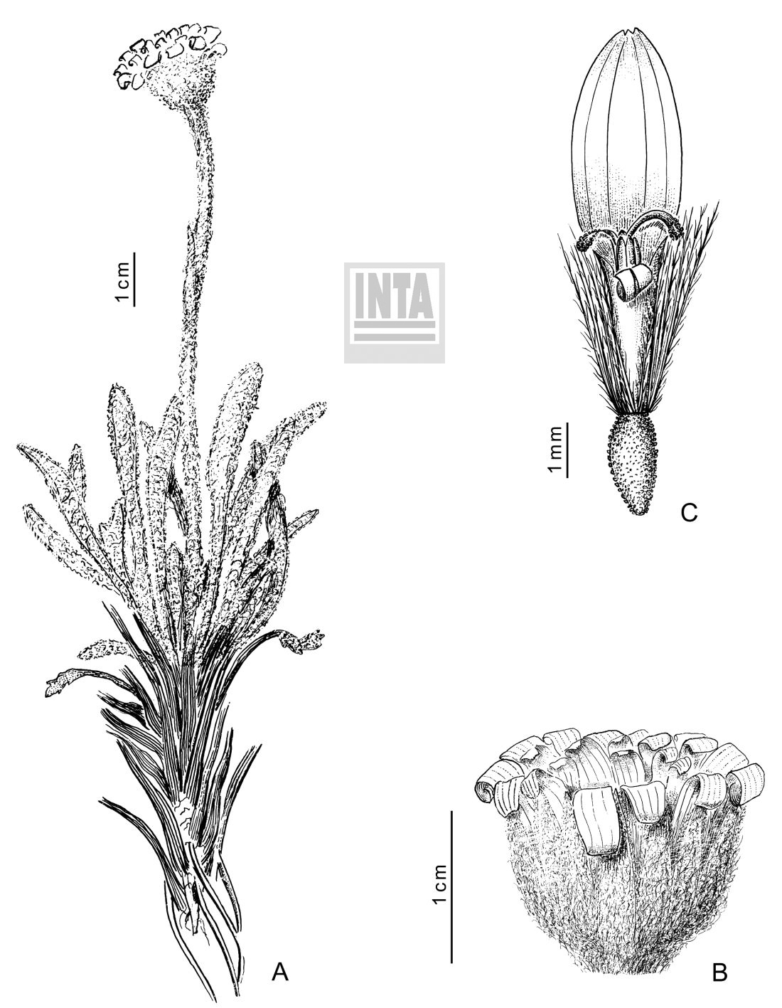 Hierbas perennes, de 10-35 cm de alto, acaules; escapos erectos, simples, densamente lanosos, laxamente foliosos. Hojas inferiores dispuestas en roseta, con pecíolo envainador; láminas oblongas a oblongo-oblanceoladas, raro obovadas, pinnatífidas, de 2,5-9,5 × 1,2-3 cm, con 7-9 pares de lóbulos oblongos a redondeados, segmentos agudos, generalmente enteros, densamente lanosos en ambas caras; hojas superiores esparcidas, lanceoladas, ensanchadas y abrazadoras en la base, agudas en el ápice. Capítulos solitarios. Involucro turbinado, de 12 × ca. 20 mm; filarios 2-seriados, linear-lanceolados, agudos, densamente lanosos. Flores ca. 100, corola blanca, las del margen con tubo de 5 mm de largo, labio exterior de 5-13 × 2-4 mm. Aquenios cilíndrico-obovoides, laxa y cortamente papiloso-pubérulos. Papus blanco, cerdas plumosas desde la base, de 6-7 mm de largo.