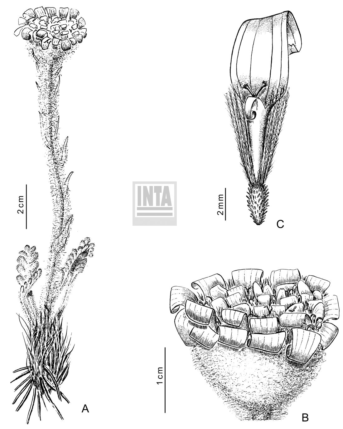 Hierbas perennes, de 10-35 cm de alto, acaules; escapos erectos, simples, densamente lanosos, laxamente foliosos. Hojas inferiores dispuestas en roseta, con pecíolo envainador; láminas oblongas a oblongo-oblanceoladas, raro obovadas, pinnatífidas, de 2,5-9,5 × 1,2-3 cm, con 7-9 pares de lóbulos oblongos a redondeados, segmentos agudos, generalmente enteros, densamente lanosos en ambas caras; hojas superiores esparcidas, lanceoladas, ensanchadas y abrazadoras en la base, agudas en el ápice. Capítulos solitarios. Involucro turbinado, de 12 × ca. 20 mm; filarios 2-seriados, linear-lanceolados, agudos, densamente lanosos. Flores ca. 100, corola blanca, las del margen con tubo de 5 mm de largo, labio exterior de 5-13 × 2-4 mm. Aquenios cilíndrico-obovoides, laxa y cortamente papiloso-pubérulos. Papus blanco, cerdas plumosas desde la base, de 6-7 mm de largo.