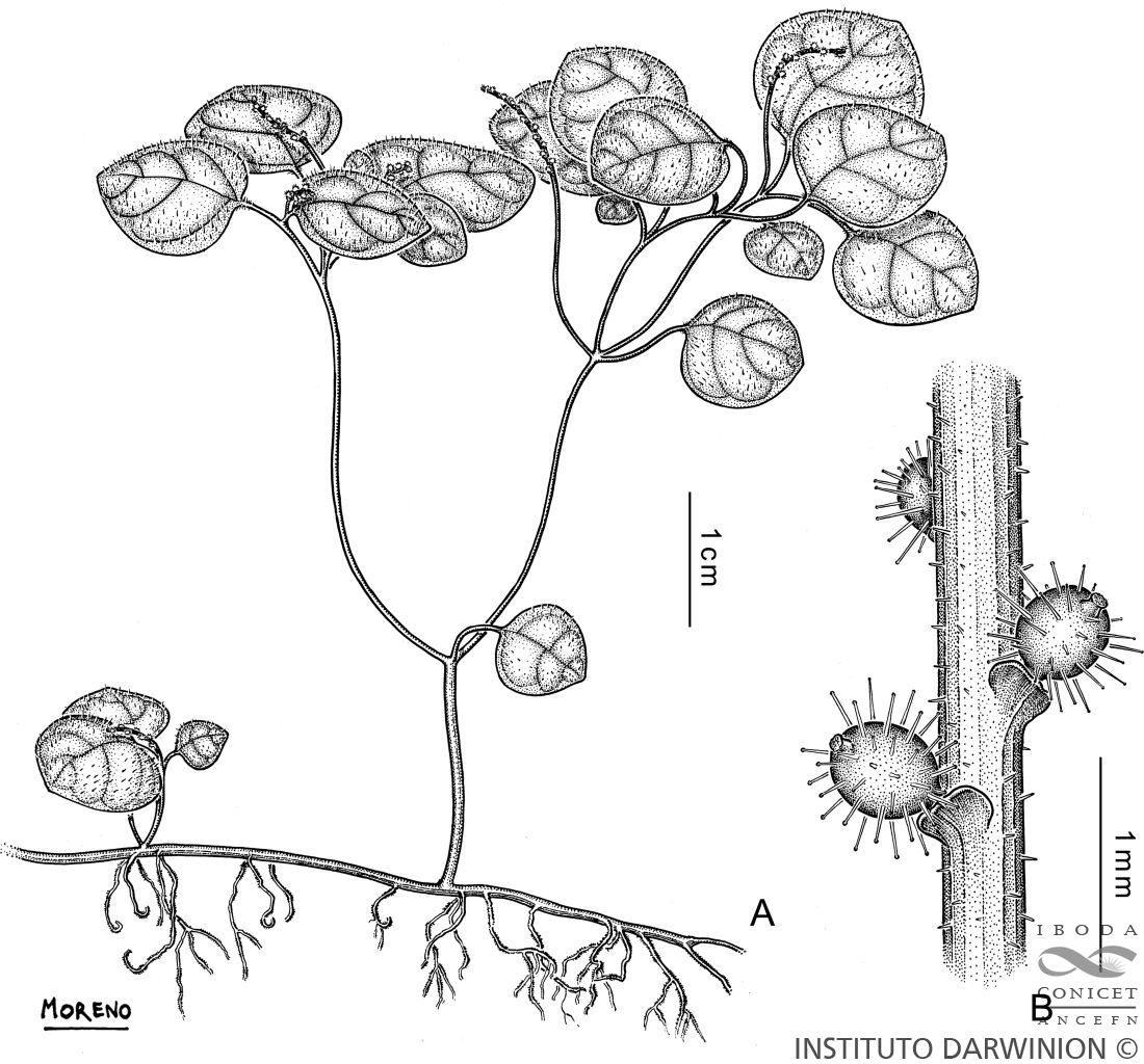 Hierbas terrestres o epífitas, delicadas, erectas, de 8-12 cm de alto; tallos radicantes en los nudos inferiores, con tricomas adpresos. Hojas alternas, con pecíolos de 0,3-0,7 cm de largo; láminas reniformes a suborbiculares, de 0,5-1,8 × 0,7-2 cm, base y ápice redondeados a obtusos, palmati-5-nervadas, con tricomas erectos en la cara adaxial. Inflorescencias solitarias, axilares, espigas filiformes, de 0,5-2 cm de largo, laxifloras; pedúnculos de 1-1,5 cm de largo; brácteas florales orbiculares. Frutos ovoides, de 0,5-1 mm de largo, brevemente estipitados, de superficie lisa, con tricomas erectos en toda su superficie, estigma apical.