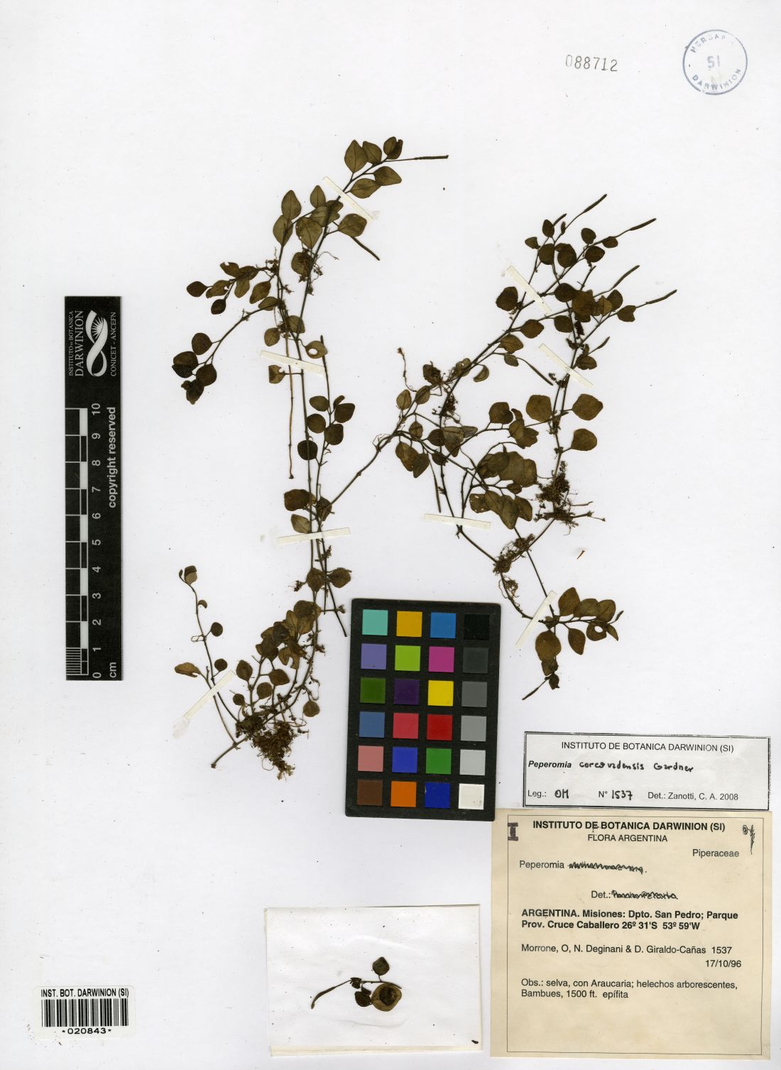Hierbas epífitas o rupícolas, erectas, de 3-6 cm de alto; tallos estoloníferos y radicantes en los nudos, entrenudos de 0,5-3 cm de largo, subglabros o hirtelos. Hojas alternas, con pecíolos de 0,3-1 cm de largo; láminas elípticas a ovadas, de 0,8-1,5(-2) × 0,5- 1(-1,5) cm, base obtusa a aguda, ápice obtuso a redondeado, cartáceas, palmati-3-nervadas, diminutamente cilioladas. Inflorescencias axilares, solitarias, espigas de 0,2-3,5(-4,5) cm de largo; pedúnculos de 0,5-2,5 cm de largo; brácteas florales orbiculares con los bordes sinuosos; raquis foveolado (las foveolas se observan entre las cavidades que dejan los frutos al desprenderse). Frutos inmersos o no en el raquis, ovoides, de 0,5-0,8 mm de largo, sésiles a brevemente estipitados, de superficie lisa, con pseudocúpula, estigma apical.