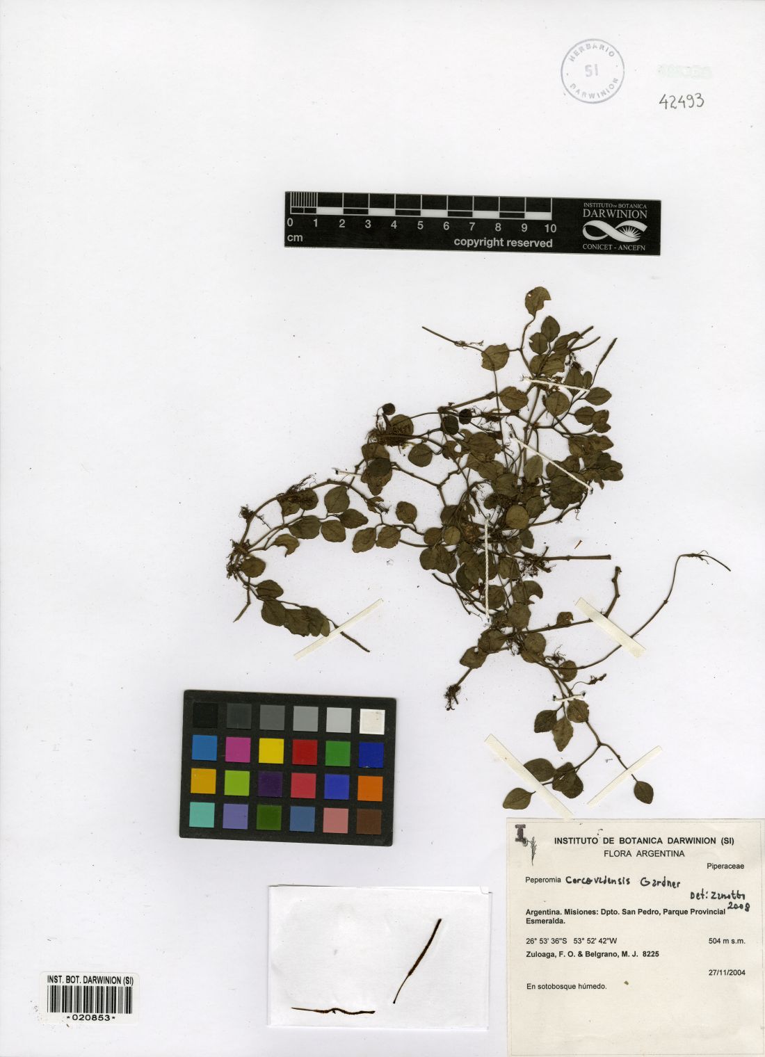 Hierbas epífitas o rupícolas, erectas, de 3-6 cm de alto; tallos estoloníferos y radicantes en los nudos, entrenudos de 0,5-3 cm de largo, subglabros o hirtelos. Hojas alternas, con pecíolos de 0,3-1 cm de largo; láminas elípticas a ovadas, de 0,8-1,5(-2) × 0,5- 1(-1,5) cm, base obtusa a aguda, ápice obtuso a redondeado, cartáceas, palmati-3-nervadas, diminutamente cilioladas. Inflorescencias axilares, solitarias, espigas de 0,2-3,5(-4,5) cm de largo; pedúnculos de 0,5-2,5 cm de largo; brácteas florales orbiculares con los bordes sinuosos; raquis foveolado (las foveolas se observan entre las cavidades que dejan los frutos al desprenderse). Frutos inmersos o no en el raquis, ovoides, de 0,5-0,8 mm de largo, sésiles a brevemente estipitados, de superficie lisa, con pseudocúpula, estigma apical.