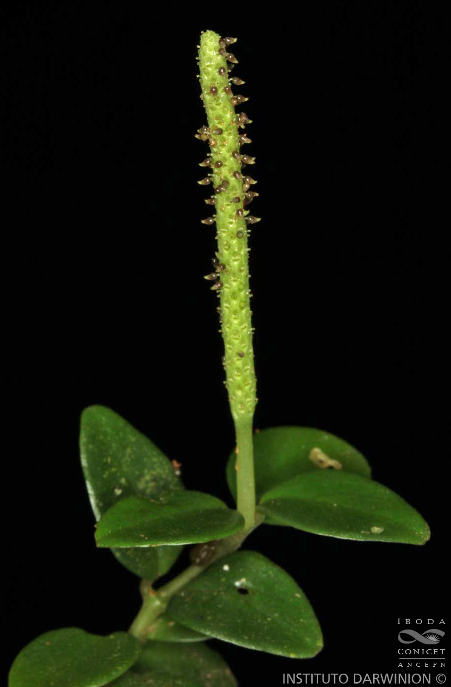 Hierbas epífitas o rupícolas, erectas, de 3-6 cm de alto; tallos estoloníferos y radicantes en los nudos, entrenudos de 0,5-3 cm de largo, subglabros o hirtelos. Hojas alternas, con pecíolos de 0,3-1 cm de largo; láminas elípticas a ovadas, de 0,8-1,5(-2) × 0,5- 1(-1,5) cm, base obtusa a aguda, ápice obtuso a redondeado, cartáceas, palmati-3-nervadas, diminutamente cilioladas. Inflorescencias axilares, solitarias, espigas de 0,2-3,5(-4,5) cm de largo; pedúnculos de 0,5-2,5 cm de largo; brácteas florales orbiculares con los bordes sinuosos; raquis foveolado (las foveolas se observan entre las cavidades que dejan los frutos al desprenderse). Frutos inmersos o no en el raquis, ovoides, de 0,5-0,8 mm de largo, sésiles a brevemente estipitados, de superficie lisa, con pseudocúpula, estigma apical.
