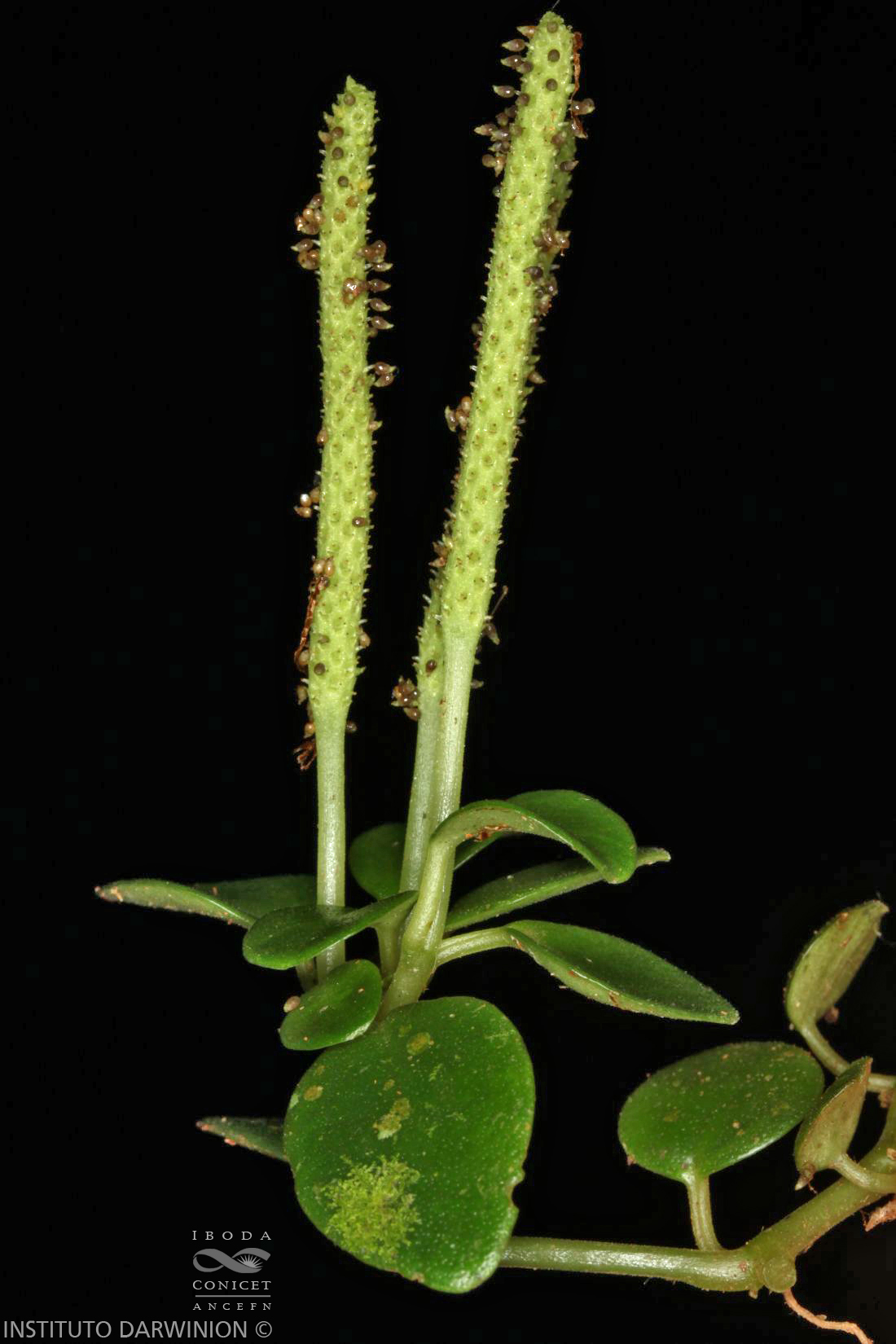 Hierbas epífitas o rupícolas, erectas, de 3-6 cm de alto; tallos estoloníferos y radicantes en los nudos, entrenudos de 0,5-3 cm de largo, subglabros o hirtelos. Hojas alternas, con pecíolos de 0,3-1 cm de largo; láminas elípticas a ovadas, de 0,8-1,5(-2) × 0,5- 1(-1,5) cm, base obtusa a aguda, ápice obtuso a redondeado, cartáceas, palmati-3-nervadas, diminutamente cilioladas. Inflorescencias axilares, solitarias, espigas de 0,2-3,5(-4,5) cm de largo; pedúnculos de 0,5-2,5 cm de largo; brácteas florales orbiculares con los bordes sinuosos; raquis foveolado (las foveolas se observan entre las cavidades que dejan los frutos al desprenderse). Frutos inmersos o no en el raquis, ovoides, de 0,5-0,8 mm de largo, sésiles a brevemente estipitados, de superficie lisa, con pseudocúpula, estigma apical.