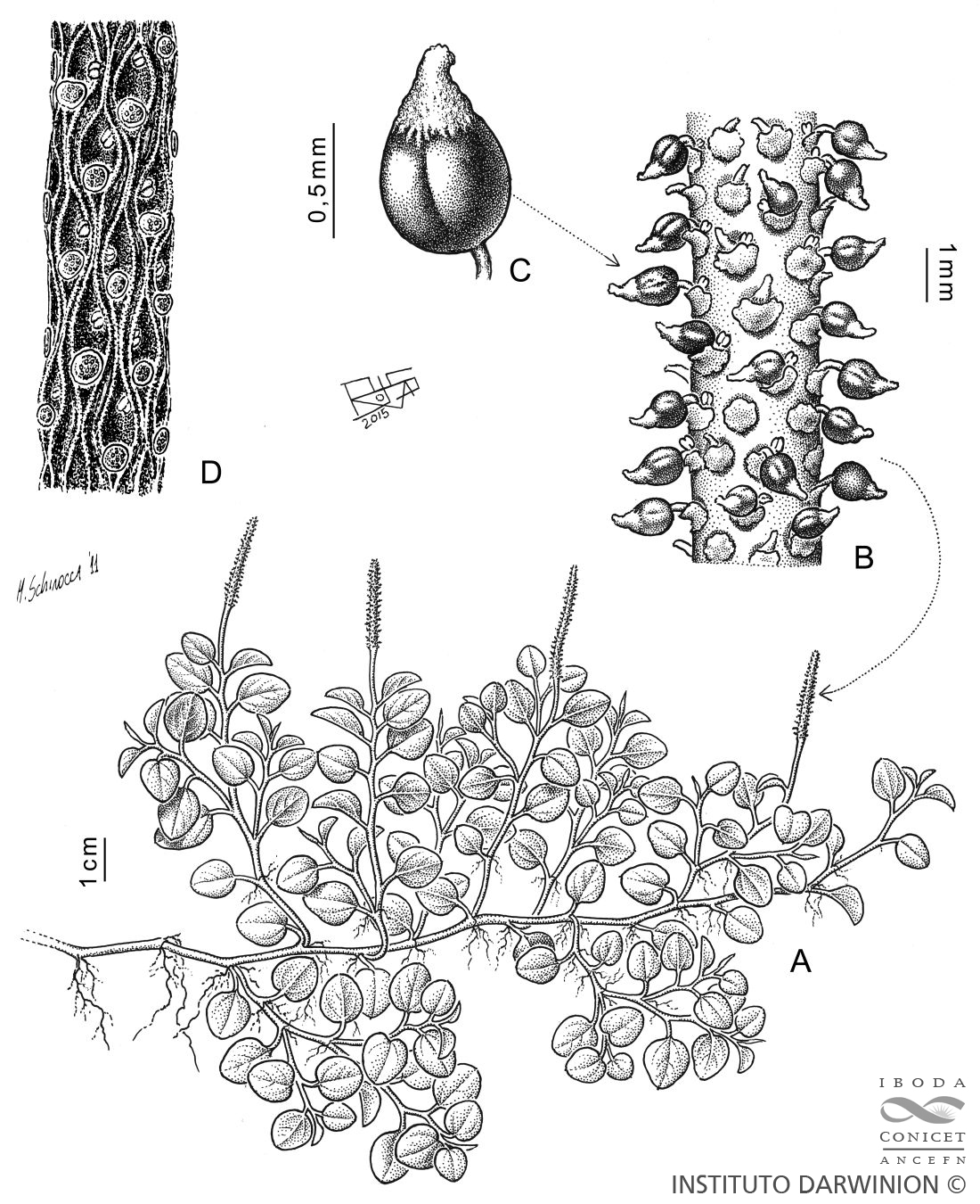 Hierbas epífitas o rupícolas, erectas, de 3-6 cm de alto; tallos estoloníferos y radicantes en los nudos, entrenudos de 0,5-3 cm de largo, subglabros o hirtelos. Hojas alternas, con pecíolos de 0,3-1 cm de largo; láminas elípticas a ovadas, de 0,8-1,5(-2) × 0,5- 1(-1,5) cm, base obtusa a aguda, ápice obtuso a redondeado, cartáceas, palmati-3-nervadas, diminutamente cilioladas. Inflorescencias axilares, solitarias, espigas de 0,2-3,5(-4,5) cm de largo; pedúnculos de 0,5-2,5 cm de largo; brácteas florales orbiculares con los bordes sinuosos; raquis foveolado (las foveolas se observan entre las cavidades que dejan los frutos al desprenderse). Frutos inmersos o no en el raquis, ovoides, de 0,5-0,8 mm de largo, sésiles a brevemente estipitados, de superficie lisa, con pseudocúpula, estigma apical.