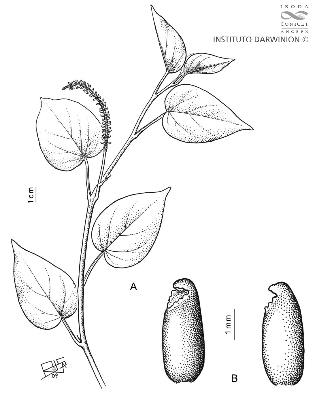 Hierbas terrestres o rupícolas, rastreras; tallos ramificados, con entrenudos de 2-5(-7) cm de largo, glabros a levemente pulverulentos en los nudos. Hojas alternas, con pecíolos de 1-4 cm de largo, canaliculados, ciliados; láminas ovado-lanceoladas, a veces asimétricas, de 2,5-6 × 2-3,5 cm, base levemente cordada a redondeada, ápice acuminado, cartáceas, con el nervio medio marcado, ciliadas hacia el ápice. Inflorescencias axilares, compuestas por 2 espigas de 7-12 cm de largo, a veces una de ellas poco desarrollada; pedúnculos de 0,8-1,2 cm de largo; brácteas florales orbiculares. Frutos cilíndricos, de 2-3 mm de largo, sésiles, de superficie papilosa-glandular, de inserción superficial en el raquis; estigma subapical, cubierto parcialmente por una protuberancia estilar dando el aspecto de un capuchón.