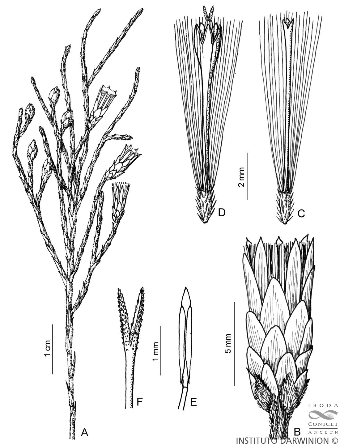 A. Rama florífera. B. Capítulo. C. Flor del margen. D. Flor del centro. E. Estambre. F. Ápice del estilo.