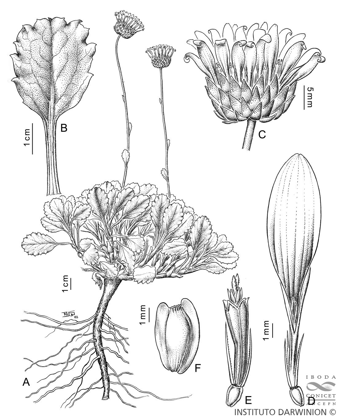 Subarbustos de 20-25 cm de alto, erectos, muy ramificados. Tallos herbáceos, foliosos. Hojas espatuladas, con pecíolos de 20-30 mm y láminas obovadas de 25-40 × 15-20 mm, ápice redondeado u obtuso, margen denticulado y ligeramente ondulado, con abundantes tricomas glandulares sésiles en ambas epidermis. Capítulos radiados, de 30-40 mm de diámetro. Involucro con series de filarios desiguales, los externos triangulares, subulados, de 3 × 1,5 mm, herbáceos, con tricomas glandulares sésiles en toda su superficie; los internos elípticos, de 10 × 3 mm, subulados, herbáceos en el ápice, con tricomas glandulares sésiles en la porción distal. Flores dimorfas, las marginales con corola ligulada, con limbo elíptico, entero a 3- dentado, de 18 × 4,5 mm; las del centro con corola tubulosa de 4,5 mm de largo. Aquenios elipsoides, de 4-5 mm de largo, aplanados, con 2 alas. Papus formado por 5-6 aristas de 4-5 mm de largo, paleáceas, apenas ciliadas en el margen.
