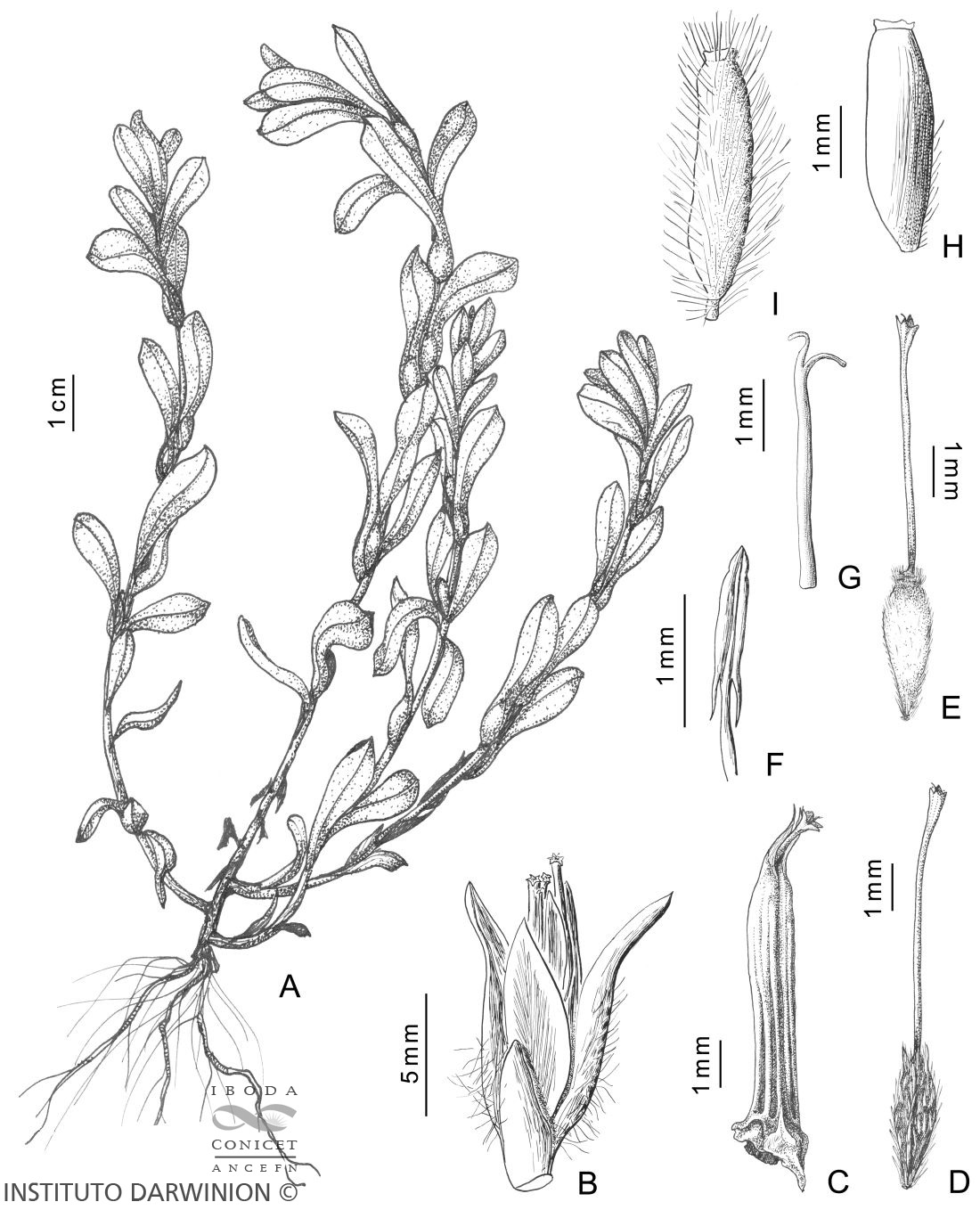 A. Planta. B. Capítulo. C. Flor central dentro de su pálea. D. Flor del margen. E. Flor del centro. F. Estambre. G. Parte superior del estilo. H. Aquenio de la flor central. I. Aquenio de la flor marginal.