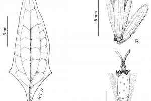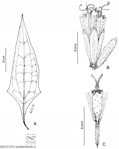 Enredaderas perennes con tallos multicostados, pubescentes. Hojas opuestas, pecioladas, con pecíolos de 0,5-1,5 cm de largo y láminas lanceolado-hastadas a romboides, de 9-12 × 2-5 cm, acuminadas en el ápice y cuneiformes en la base, generalmente con un lóbulo triangular a cada lado; haz glabrescente y envés con pubescencia escasa; en ambas caras la pilosidad es abundante sobre las venas; domacios «en bolsillo» y «en canal»; estípulas ausentes. Capítulos numerosos, pedunculados, dispuestos en inflorescencias paniculiformes terminales y axilares. Involucro de 5 mm de alto; filarios oblongos, con callosidad basal y ápice agudo, laxamente pubescentes en el dorso, de 1,3 mm de ancho; bractéola foliosa, lanceolada, aguda, con los márgenes pilosos, de 5 × 1,5 mm, inserta junto al involucro. Flores con corola blanca, tubulosa, glandulosa, de 4 mm de largo, con tubo muy corto (± 1 mm) y limbo cilíndrico de 3 mm de largo, dividido en lóbulos subtriangulares de 0,4-0,5 mm de largo. Aquenios glandulosos, de ± 3,5 mm de largo. Papus de 4 mm de largo, compuesto por ca. 50 aristas.