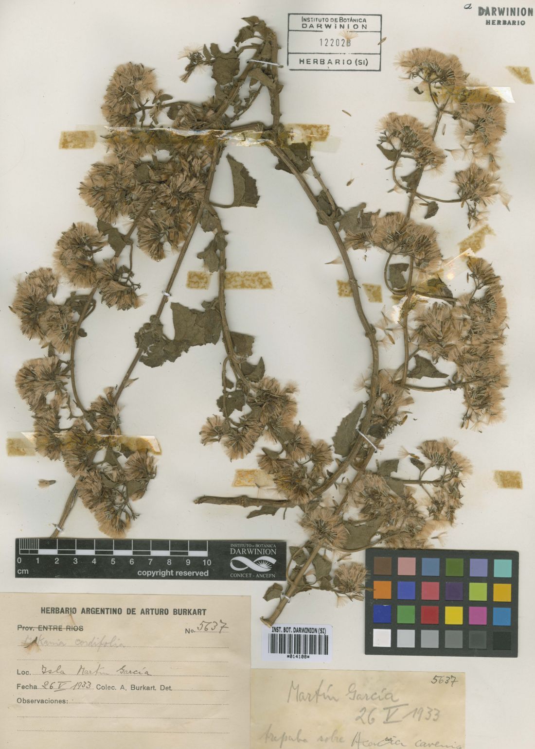 Enredaderas con tallos jóvenes delgados, 6-costados, cortamente tomentosos a glabros, los basales gruesos, hasta de 2-3 cm de diámetro, 6-costados. Hojas opuestas, pecioladas, con pecíolos de 1,5-5 cm de largo y láminas ovadas o acorazonadas, de 2-12 × 1,5-10 cm, de ápice agudo, denticuladas, levemente discoloras; pelos cortos, hirsutos en la haz y flexibles en el envés y pelos glandulares punctiformes en ambas epidermis; estípulas setiformes inconspicuas o ausentes. Capítulos numerosos, pedunculados, ordenados en cimas corimbiformes compuestas, terminales y axilares. Involucro de 6-9 mm de alto; filarios oblongolanceolados, pubescentes, agudos, de 1,5-2 mm de ancho; bractéola pubescente, angostamente elíptica, de 4,5-5 ×1,3-1,5 mm. Flores con corola blanca, bilabiada, de 4,5-6 mm de largo; tubo de 1,7-2,7 mm y limbo corolino infundibuliforme a campanulado de 2,8-3,4 mm de largo, dividido en lóbulos lanceolados con márgenes ondulados de distinta longitud, los internos de 1,3-2 mm y el externo de 1,7-2,5 mm de largo. Aquenios laxamente pubescentes, con los bordes ciliados, de 3,5-5 mm de largo. Papus amarillento, ferrugíneo o rosado, formado por 50-70 aristas escábridas, ca. 4,5 mm de largo.
