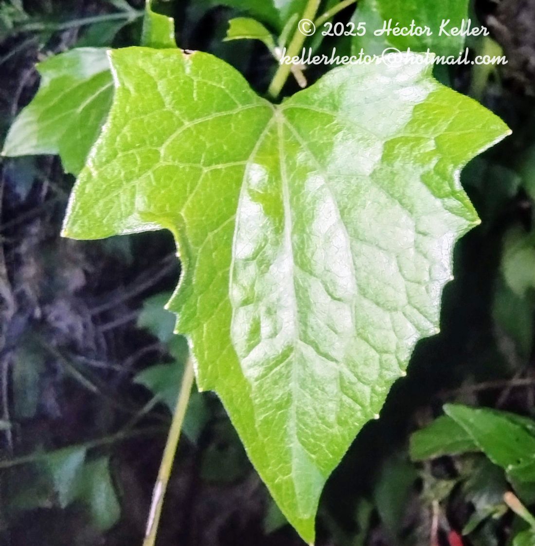 Enredaderas con tallos jóvenes delgados, 6-costados, cortamente tomentosos a glabros, los basales gruesos, hasta de 2-3 cm de diámetro, 6-costados. Hojas opuestas, pecioladas, con pecíolos de 1,5-5 cm de largo y láminas ovadas o acorazonadas, de 2-12 × 1,5-10 cm, de ápice agudo, denticuladas, levemente discoloras; pelos cortos, hirsutos en la haz y flexibles en el envés y pelos glandulares punctiformes en ambas epidermis; estípulas setiformes inconspicuas o ausentes. Capítulos numerosos, pedunculados, ordenados en cimas corimbiformes compuestas, terminales y axilares. Involucro de 6-9 mm de alto; filarios oblongolanceolados, pubescentes, agudos, de 1,5-2 mm de ancho; bractéola pubescente, angostamente elíptica, de 4,5-5 ×1,3-1,5 mm. Flores con corola blanca, bilabiada, de 4,5-6 mm de largo; tubo de 1,7-2,7 mm y limbo corolino infundibuliforme a campanulado de 2,8-3,4 mm de largo, dividido en lóbulos lanceolados con márgenes ondulados de distinta longitud, los internos de 1,3-2 mm y el externo de 1,7-2,5 mm de largo. Aquenios laxamente pubescentes, con los bordes ciliados, de 3,5-5 mm de largo. Papus amarillento, ferrugíneo o rosado, formado por 50-70 aristas escábridas, ca. 4,5 mm de largo.