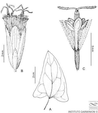 Enredaderas perennes con tallos multiestriados, rojizos, laxamente pubescentes. Hojas opuestas, pecioladas, con pecíolo de 0,8-2 cm de largo y láminas ovado-deltoides, de 2,5-8 × 1-6 cm, coriáceas, con base ligeramente subcordada y ápice agudo, el margen liso o suavemente ondulado; envés con pelos simples, enmarañados, abundantes, y haz con pelos simples, más cortos y rígidos; domacios «en bolsillo» basales, centrales y laterales, no en todas las intersecciones de las nervaduras, que son bien marcadas; estípulas ausentes. Capítulos muy numerosos, pedunculados, dispuestos en panículas terminales y axilares. Involucro de 6-7 mm de alto; filarios lanceolados, de 3-1,7 mm de ancho, de ápice agudo, laxamente pubescentes; bractéola lanceolada, pubescente, de 2 mm × 0,5 mm. Flores con corola blanca, tubulosa, de 4,5-5,3 mm de largo, con tubo de 2,5-2,8 mm de largo y limbo acampanado de 2-2,5 mm de largo, dividido en lóbulos lanceolados de 1-1,5 mm de largo, ciliados en sus márgenes; nervios submarginales conspicuos. Aquenios de 3-4 mm de largo, glabros en la base, pubescentes en el ápice. Papus blanco-amarillento, compuesto por 60-75 aristas de 5 mm de largo.