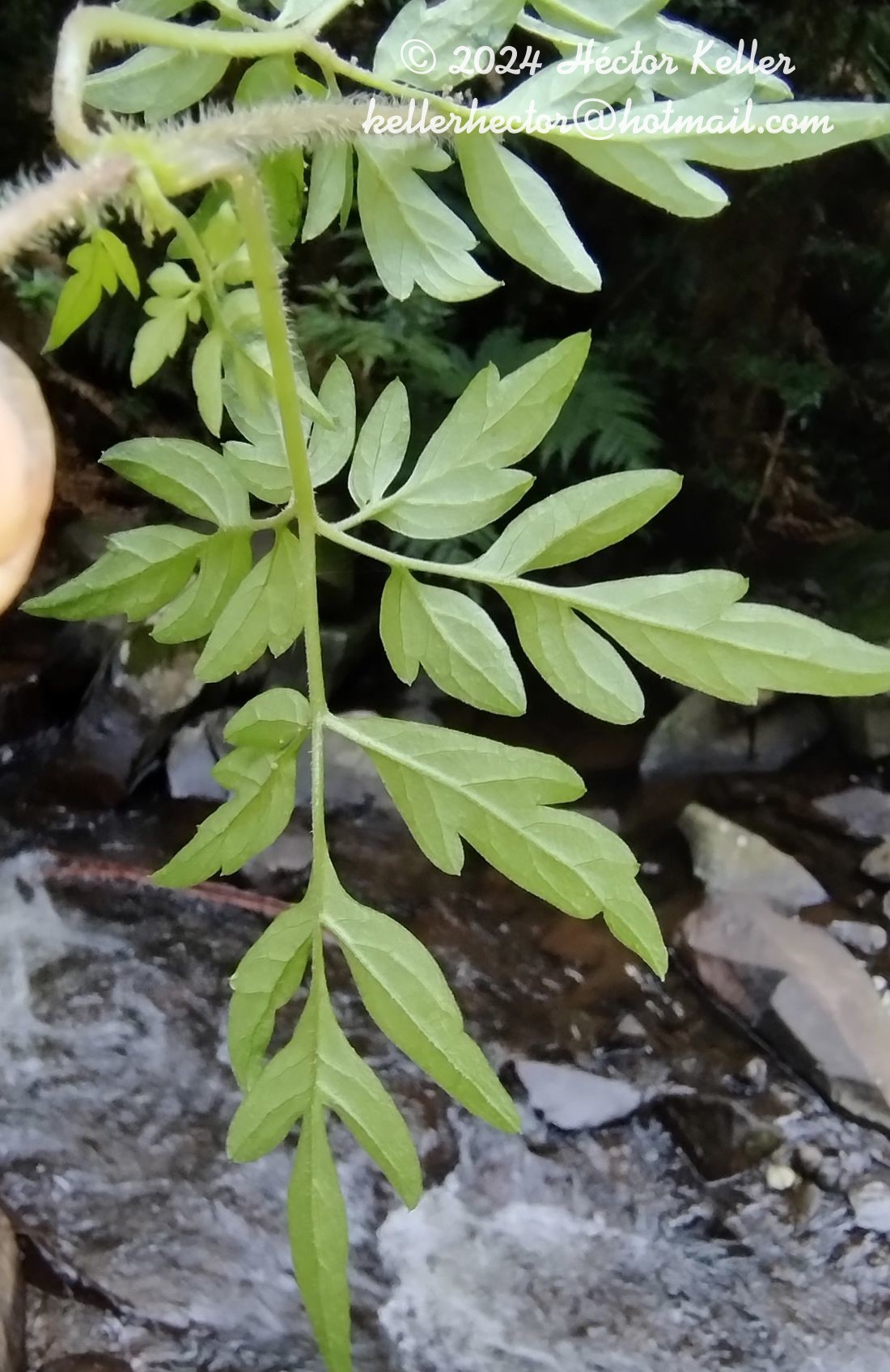 Enredadera con tallos multiestriados, cubiertos de pelos simples, largos, flexibles, entremezclados con pelos glandulares cortos. Hojas opuestas, largamente pecioladas, con pecíolos de 2-6 cm de largo y láminas palmaticompuestas, de 4-8 x 3-7 cm, con 3-5 folíolos oval-lanceolados, profundamente lobulados a pinnatisectos, de borde liso o ligeramente aserrado; pelos simples muy dispersos en haz y envés; estípulas laciniadas. Capítulos numerosos, pedunculados, dispuestos en cimas corimbiformes terminales y axilares. Involucro ca. 9 mm de alto; filarios lanceolados, ca. 2-3 mm de ancho, marcadamente acuminados, cubiertos de pelos glandulares, entre los que se entremezclan pocos pelos simples; bractéola oblanceolada de 4,5-5,5 x 0,6-1 mm, de ápice agudo, con pelos glandulares en el dorso, inserta por debajo del involucro. Flores con corola blanca, tubulosa, de 6,5 mm de largo, con tubo de 2,5 mm y limbo campanulado de 4 mm de largo, dividido en lóbulos de 1 mm de largo. Aquenios de 5,5 mm de largo, glabros o poco pilosos. Papus amarillento o rosado, con 70 aristas escábridas de aproximadamente 7 mm de largo.