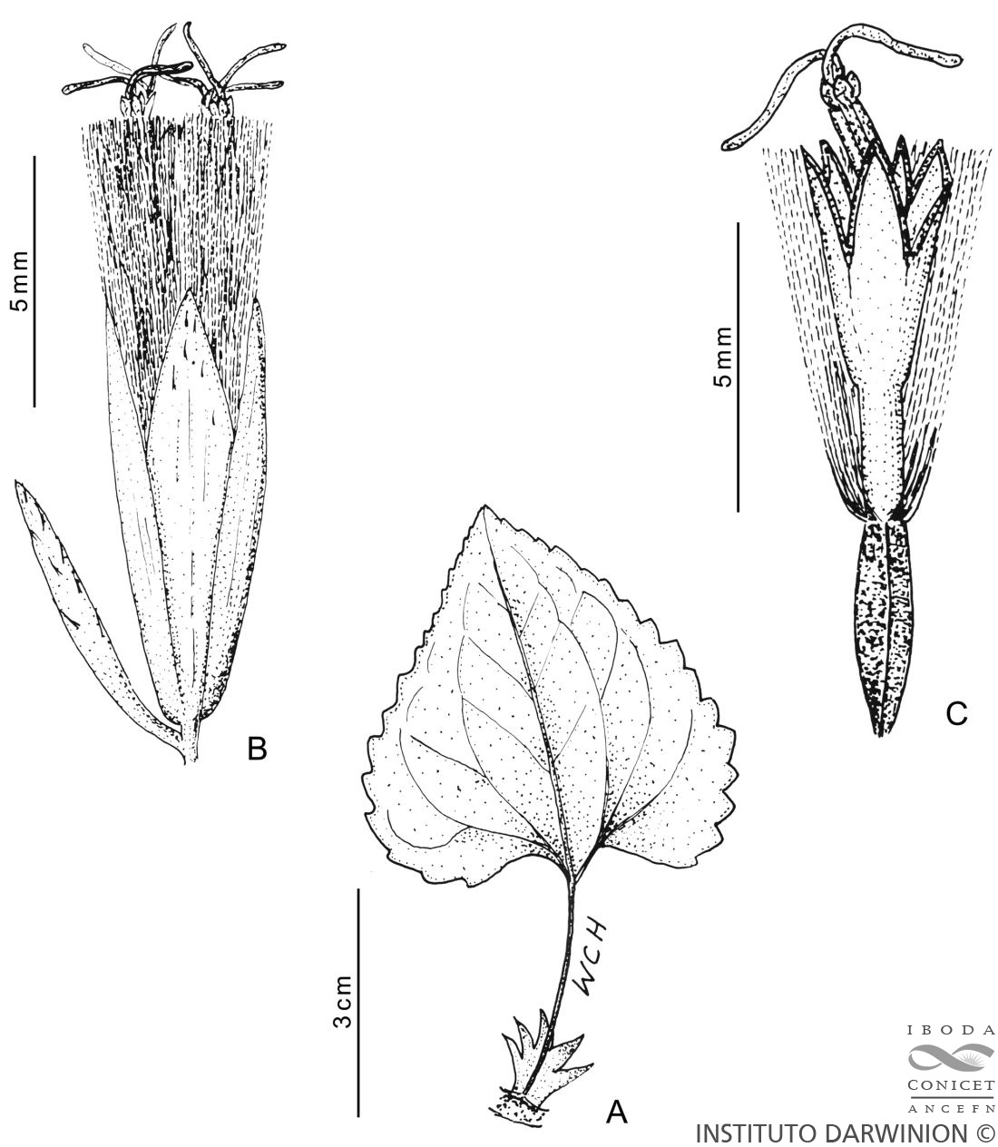 A. Hoja. B. Capítulo. C. Flor. Tomado de Fl. Paraguay 25: 238, fig. 93. 1996.