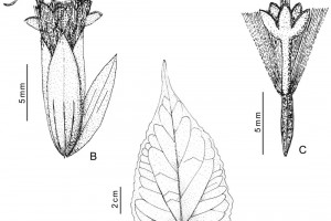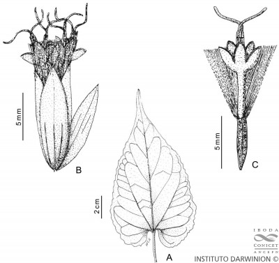 Enredaderas perennes, con tallos multiestriados laxamente pubescentes. Hojas opuestas, pecioladas, con pecíolos de 1-2,5 cm de largo y láminas largamente ovadas, de 3-10 × 1,5-5 cm, con margen irregularmente dentado a ondulado, base atenuada o subcordada y ápice acuminado, con pelos simples, escasos, en ambas caras, más abundantes sobre las nervaduras; domacios «en bolsillo» en la intersección de algunas nervaduras; estípulas laciniadas, cortas. Capítulos muy numerosos, pedunculados, dispuestos en cimas paniculiformes terminales y axilares. Involucro de 7,5-8,5 mm de alto; filarios oblongo-lanceolados de 2-2,5 mm de ancho, de ápice agudo, pubescente; bractéola elíptica, de 6 × 1,5-2 mm, foliosa, de ápice agudo, glabrescente en el dorso, generalmente pilosa en el ápice. Flores con corola blanca, tubulosa, de 6-8 mm de largo, con tubo de 4-5 mm y limbo anchamente acampanado de 2 mm de largo, dividido en lóbulos de 1 mm de largo. Aquenios pilosos, con costillas ciliadas, de 4,5- 5 mm de largo. Papus rosado de 7 mm de largo, formado por aproximadamente 100 aristas escábridas.
