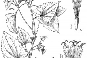 Enredaderas perennes, con tallos multiestriados glabros o ligeramente pubescentes. Hojas opuestas, pecioladas, con pecíolos de 2-5 cm de largo y láminas ovado-deltoides, de 4-10 × 3-7 cm, de base cordiforme, irregularmente aserradas en el margen y acuminadas en el ápice, con pelos glandulares punctiformes y pelos cortos y rígidos en epifilo e hipofilo; sobre las nervaduras, pelos flexibles; domacios «en bolsillo» basales, centrales y laterales y «en canal» a lo largo de la nervadura media; estípulas laciniadas. Involucro de 5-6 mm de alto; filarios oblongos, de 1,5-1,8 mm de ancho, agudos o subobtusos, laxamente pubescentes; bractéola elíptica, de 5 × 1,5-2 mm, foliosa, aguda, pubescente. Capítulos numerosos, pedunculados, dispuestos en cimas corimbiformes axilares y terminales. Flores con corola blanca, tubulosa, de 5 mm de largo, con tubo de 2,5 mm y limbo estrechamente infundibuliforme poco ensanchado de 2,5 mm, dividido en lóbulos triangulares de 1 mm de largo. Aquenios glandulosos de 3,5-4 mm de largo. Papus blanco-amarillento, de 4 mm de largo, con 50-55 aristas.