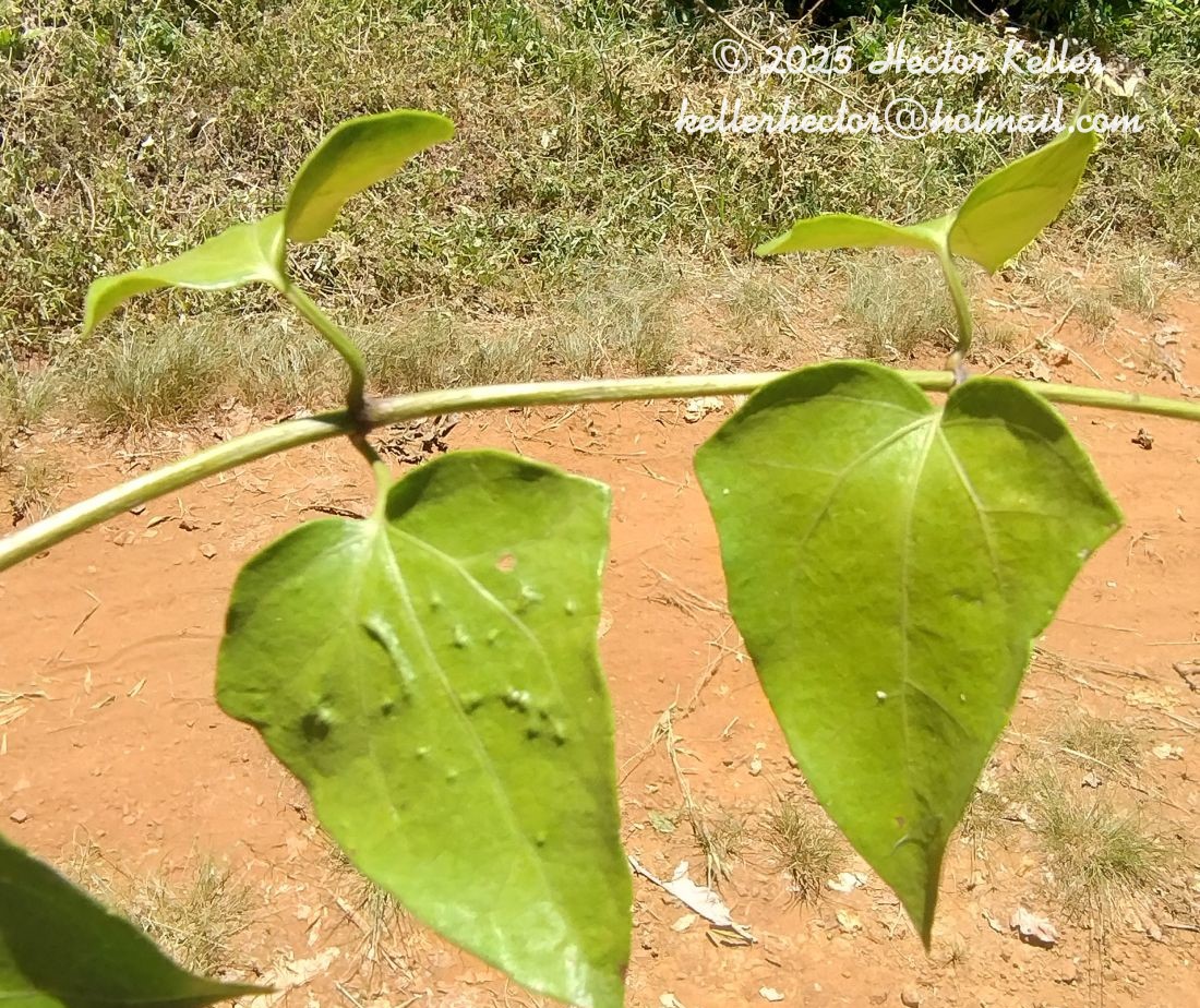 Enredaderas perennes con tallos multiestriados, glabros (cortos pelos pueden encontrarse a la altura de los nudos). Hojas opuestas, pecioladas, con pecíolos de 2-3 cm de largo y láminas ovadas, de 6-12 × 4-8 cm, con bases redondeadas a ligeramente cordiformes, caudadas, de borde liso, glabrescentes en ambas caras; estípulas ausentes. Capítulos numerosos, pedunculados, dispuestos en cimas paniculiformes laxas, terminales y axilares. Involucro ca. 6 mm de alto; filarios oblanceolados u oblongolanceolados, de 1,7-2 mm de ancho, obtusos, cortamente mucronados en el ápice, glabros; bractéola oval o ovada, de 4,5- 5,5 × 1,8-2 mm, foliosa, con ápice agudo. Flores con corola blanca, tubulosa, de 4,5 mm de largo, con tubo de 2,5 mm y limbo campanulado de 1,8 mm de largo, dividido en lóbulos triangulares de 1 mm de largo. Aquenios de 3 mm de largo, glabros. Papus de 4,5-5 mm de largo, amarillento o rosado, provisto de 50 aristas.