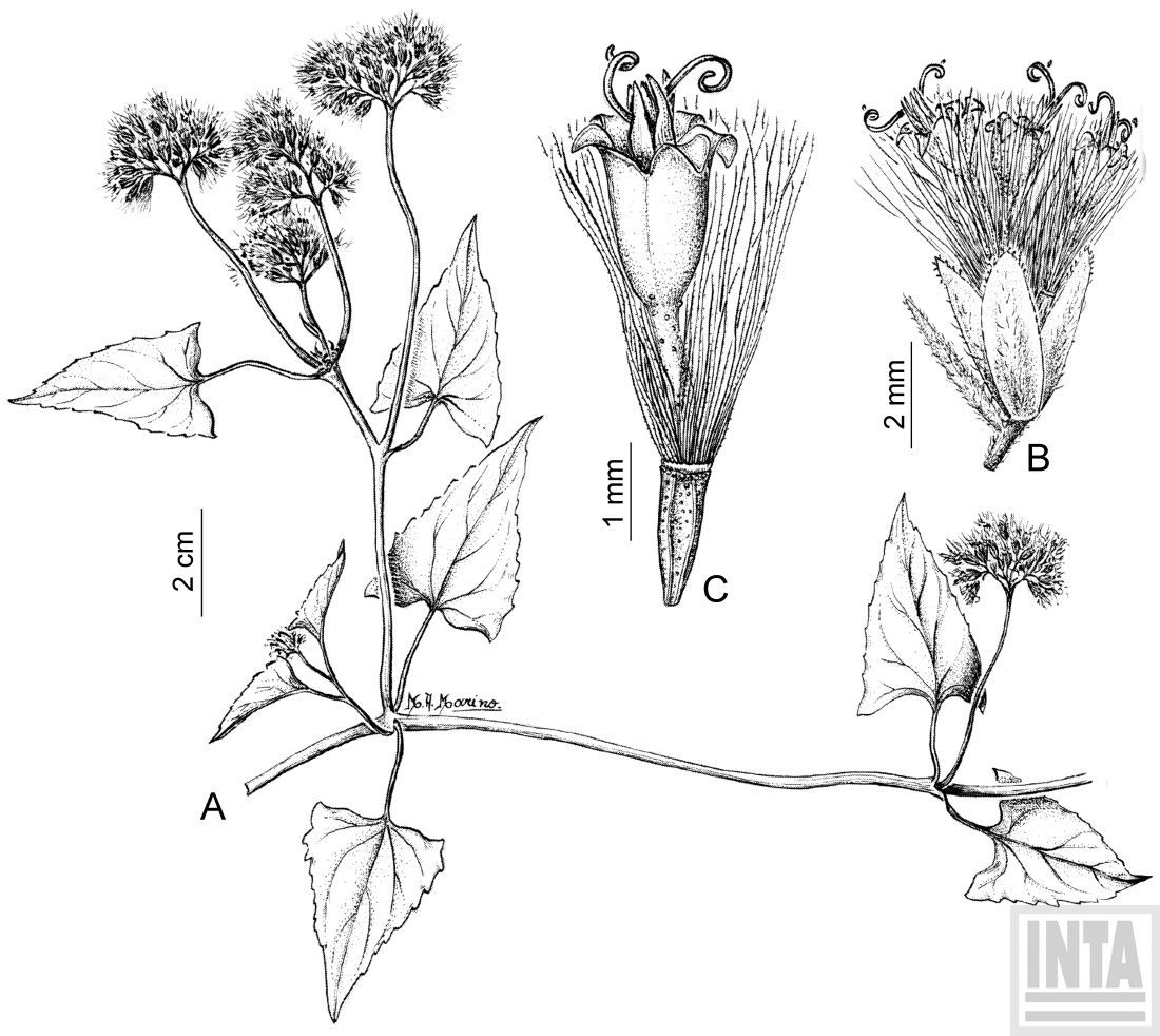 Plantas herbáceas, volubles, con tallos pubescentes, 6- costados. Hojas opuestas, pecioladas, con pecíolos de 0,5-2 cm de largo y láminas ovado-deltoides, de 1-2,5 × 1-2,5 cm, a veces casi tan largas como anchas, con margen liso, ápice obtuso, base truncada, pelos simples y glandulares punctiformes en ambas caras, siendo los pelos simples rígidos en la haz y más abundantes y flexibles en el envés; estípulas inconspicuas. Capítulos numerosos, pedunculados, dispuestos en cimas paniculiformes terminales y axilares. Involucro de 2-3 mm de alto; filarios oblongo-elípticos, 0,9 mm de ancho, con ápice agudo, pilosos en la parte media superior; bractéola angostamente elíptica, de 1,6 × 0,8 mm, pilosa, ubicada en la base del pedúnculo. Flores con corola blanca, tubulosa, de 2,7 mm de largo, tubo de 1 mm y limbo infundibuliforme de 1,7 mm de largo, dividido en lóbulos triangulares de 0,2-0,3 mm de largo. Aquenios glandulosos de 1,2-1,5 mm de largo. Papus de 2,5 mm de largo, blanco, con ca. 26 aristas escábridas.