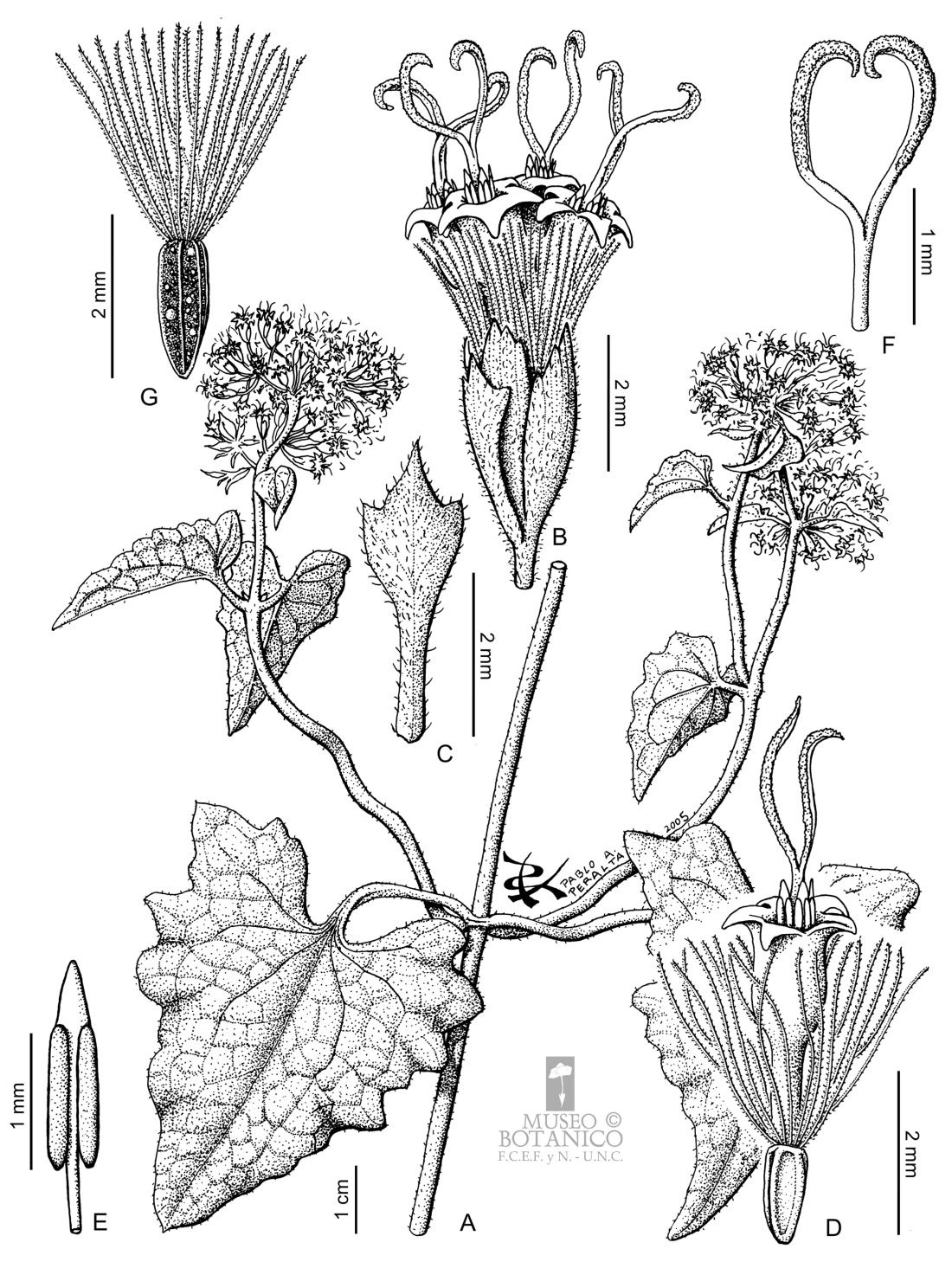 Enredaderas perennes, con tallos multiestriados, glabros o subglabros. Hojas opuestas, pecioladas, con pecíolos de 1-5 cm de largo y láminas ovado-acorazonadas u ovado-hastadas, de 2- 10 × 1,5-9 cm, irregularmente dentadas, glabras o con pubescencia rala; envés, con pelos glandulares diminutos, subsésiles, presentes también en bractéolas, filarios y aquenios; estípulas setiformes, inconspicuas. Capítulos numerosos, pedunculados, ordenados en densas cimas corimbiformes compuestas, terminales y axilares. Involucro de 2,2-2,8 mm de alto; filarios ovado-elípticos u oblongos, de 0,9-1,2 mm de ancho, obtusos, ligeramente pubescentes; bractéola linear-lanceolada o angostamente obovada, de 2,5-3 × 0,6-1,4 mm, pubescente, entera hasta rómbica, y entonces con 1(-2) dientes agudo a cada lado. Flores con corola blanca, tubulosa, de 2,8-3,7(-4,5) mm de largo, con tubo de 1-1,5 mm y limbo campanulado de 1,5-2(-3) mm de largo, con lóbulos de 0,5-0,7 mm de largo. Aquenios laxamente pilosos, de 1,2-1,6 mm de largo. Papus blanco, formado por 30- 35, excepcionalmente más, aristas escábridas delgadas en toda su extensión, de igual altura que la corola.