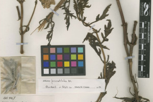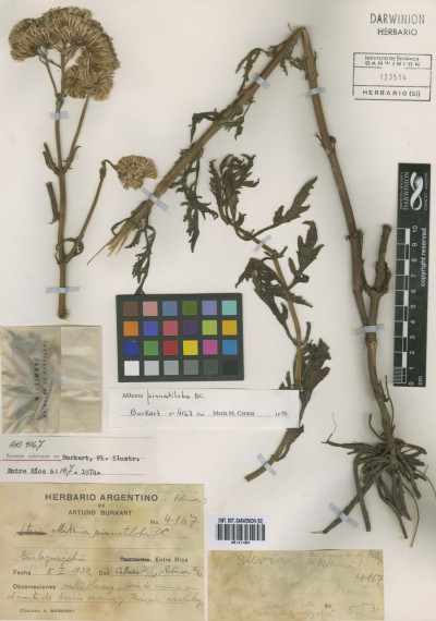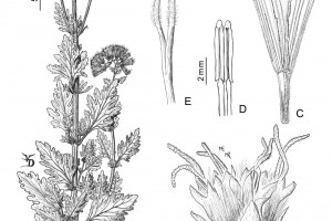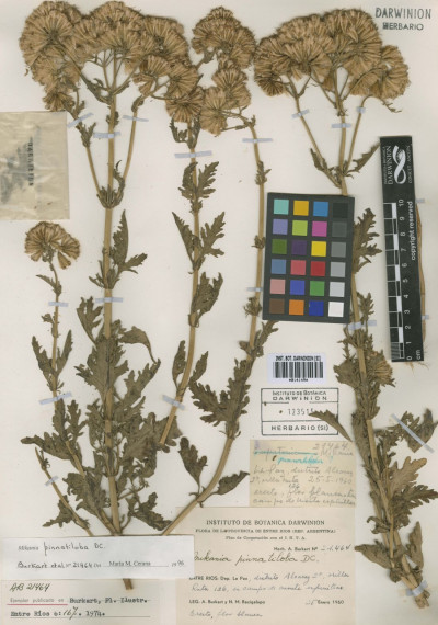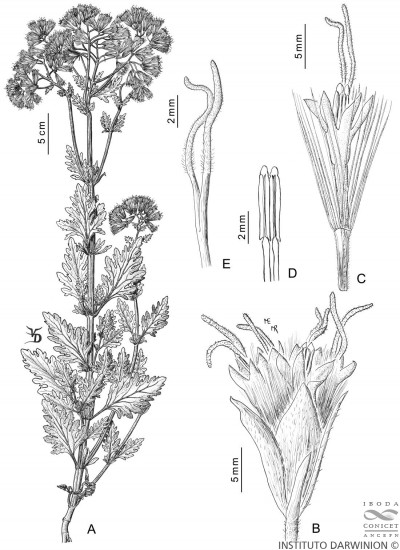 Hierbas erectas, robustas, perennes, de 40 a 70 cm de alto, con tallos multiestriados escasamente pubescentes en la parte superior. Hojas oval-lanceoladas o lanceoladas, de 5-10 × 2-5 cm, pinnatilobadas o pinnatisectas, opuestas, terminadas en pseudopecíolo y con ápice agudo; margen liso a ligeramente dentado, pelos simples y glandulares punctiformes entremezclados, más abundantes en el envés; estípulas foliosas, partidas. Involucro de 8-9 mm de alto; filarios lanceolados u oblongo-lanceolados, de 2-3 mm de ancho, pubescentes; bractéola linear-lanceolada o lanceolada, de 2,8-5,5 × 0,5-0,6 mm, pilosa. Capítulos numerosos, con pedúnculos cortos, pubescentes, dispuestos en cimas corimbiformes terminales y axilares. Flores con corola blanca, tubulosa, de 7,4-8,2 mm de largo con tubo de 3,6-4,2 mm y limbo infundibuliforme de 3,8-4,3 mm de largo, con lóbulos lanceolados de 2,2-2,3 mm de largo, ligeramente ondulados en el margen, Aquenios de 4 mm de largo, pubescentes. Papus amarillento o rosado, de 8-9 mm de largo, con 90-135 aristas escábridas.