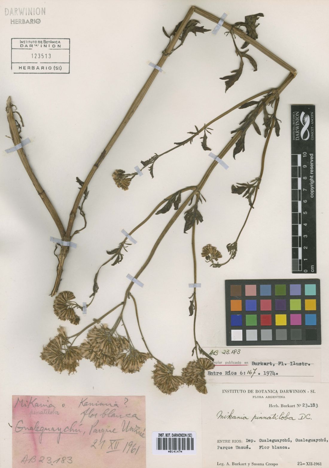 Hierbas erectas, robustas, perennes, de 40 a 70 cm de alto, con tallos multiestriados escasamente pubescentes en la parte superior. Hojas oval-lanceoladas o lanceoladas, de 5-10 × 2-5 cm, pinnatilobadas o pinnatisectas, opuestas, terminadas en pseudopecíolo y con ápice agudo; margen liso a ligeramente dentado, pelos simples y glandulares punctiformes entremezclados, más abundantes en el envés; estípulas foliosas, partidas. Involucro de 8-9 mm de alto; filarios lanceolados u oblongo-lanceolados, de 2-3 mm de ancho, pubescentes; bractéola linear-lanceolada o lanceolada, de 2,8-5,5 × 0,5-0,6 mm, pilosa. Capítulos numerosos, con pedúnculos cortos, pubescentes, dispuestos en cimas corimbiformes terminales y axilares. Flores con corola blanca, tubulosa, de 7,4-8,2 mm de largo con tubo de 3,6-4,2 mm y limbo infundibuliforme de 3,8-4,3 mm de largo, con lóbulos lanceolados de 2,2-2,3 mm de largo, ligeramente ondulados en el margen, Aquenios de 4 mm de largo, pubescentes. Papus amarillento o rosado, de 8-9 mm de largo, con 90-135 aristas escábridas.